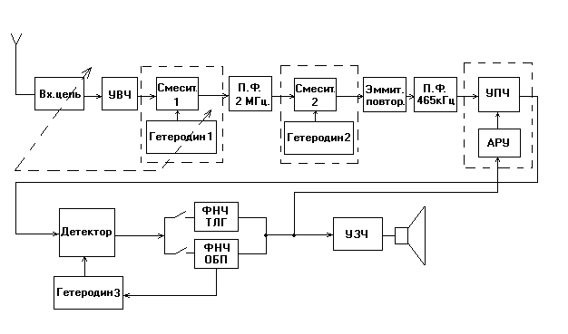 2. Состав и назначение элементов РПУ. 2.1 Данное радиоприемное устройство построено по супергетеродинной схеме с двойным преобразованием частоты и имеет фильтры в тракте звуковой частоты. Эти фильтры предназначены для: ТЛГ – амплитудная телеграфия с полосой 100 Гц и ОБП – телефонный однополосный сигнал с подавленной несущей с полосой 3 кГц . Питается данное РПУ от двухполярного источника питания, который в свою очередь питается от сети переменного напряжения 220В., 50Гц. 2.2 Функциональная схема РПУ.