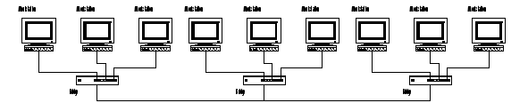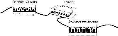 Рис. Репитер соединяет отрезки кабеля и усиливает сигнал. Преимущества и недостатки такой топологии очевидны. Преимущества: