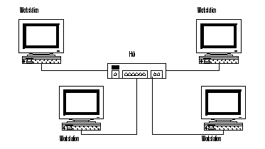 Эта топология одна из наиболее широко распространенных структур сетей ПД. Она широко использовалась в 60-х -70-х годах, поскольку благодаря легкости управления ПО было не сложным, а поток трафика простым. Весь трафик исходит из центрального узла звезды, который представлял из себя главную ЭВМ, а остальные узлы являлись терминалами. Концентраторы В настоящее время одним из стандартных компонентов сетей становится концентратор. А в сетях с топологией «звезда» он служит центральным узлом. Среди концентраторов выделяются активные (active) и пассивные (passive). Активные концентраторы. Активные концентраторы регенерируют и передают сигналы так же, как это делают репитеры. Иногда их называют многопортовыми репитерами — они обычно имеют от 8 до 12 портов для подключения компьютеров. Пассивные концентраторы. Некоторые типы концентраторов являются пассивными, например монтажные панели или коммутирующие блоки. Они просто пропускают через себя сигнал как узлы коммутации, не усиливая и не восстанавливая его. Пассивные концентраторы не надо подключать к источнику питания. Гибридные концентраторы.Гибридными (hybrid) называются концентраторы, к которым можно подключать кабели различных типов. Сети, построенные на концентраторах, легко расширить, если подключить дополнительные концентраторы. Концентраторы работают на первом уровне.