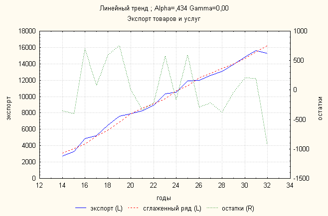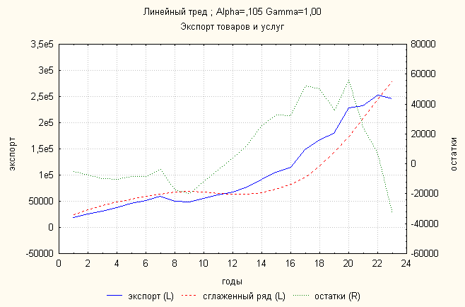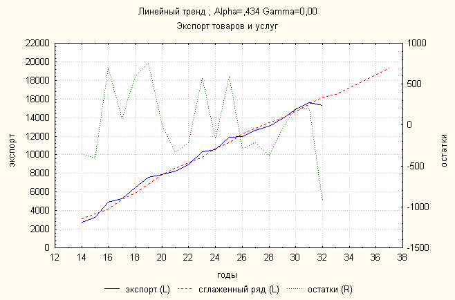 Ошибка 0,11 Анализ динамики экспорта товаров и услуг показал, что линейный тренд дает наименьшую ошибку. По нему делаем прогноз: