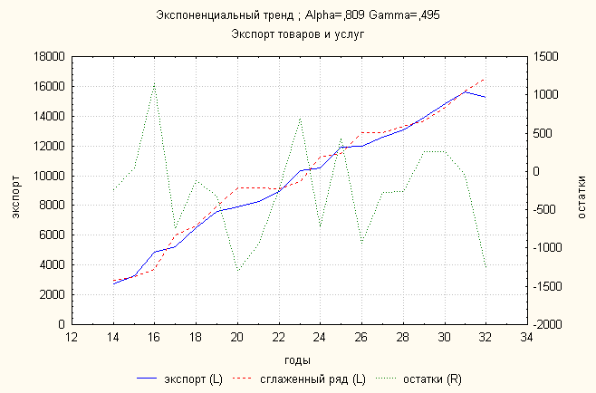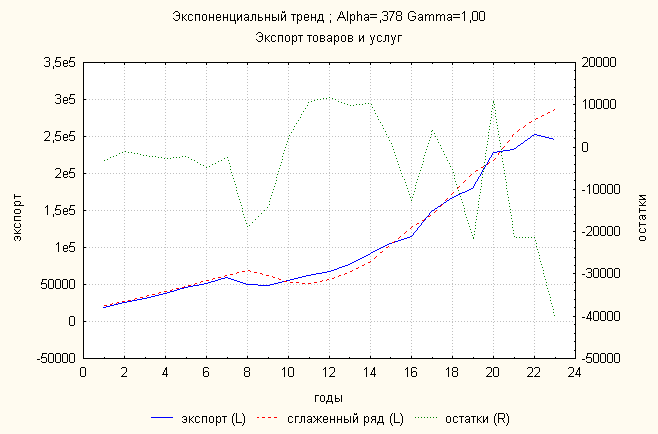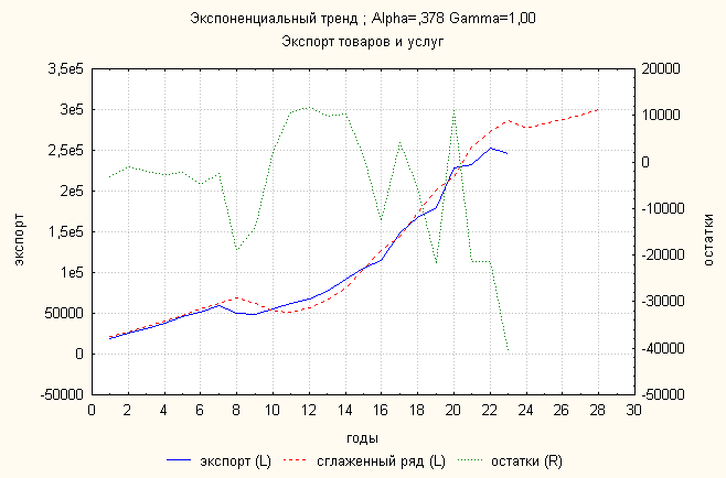 Ошибка 0,11 Анализ динамики экспорта товаров и услуг показал, что экспоненциальный тренд дает наименьшую ошибку. По нему делаем прогноз: