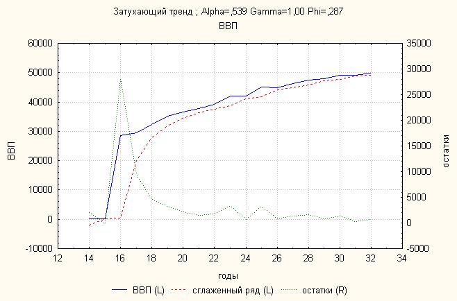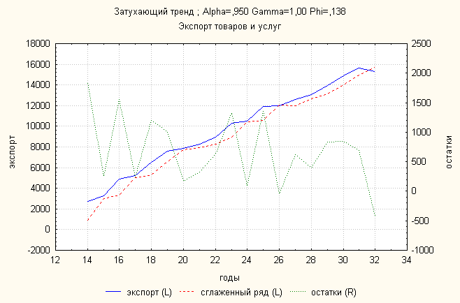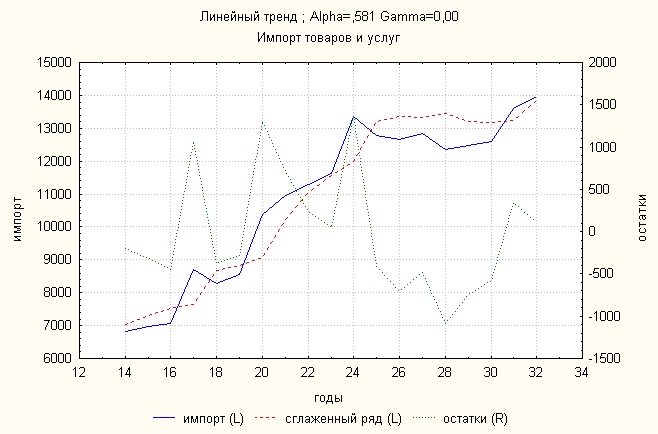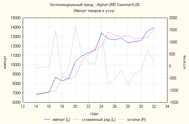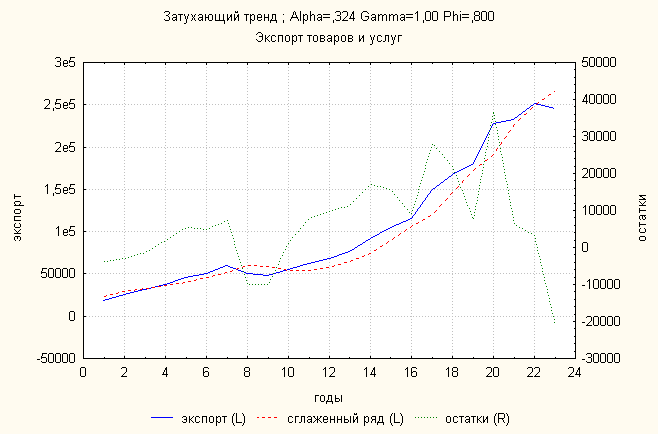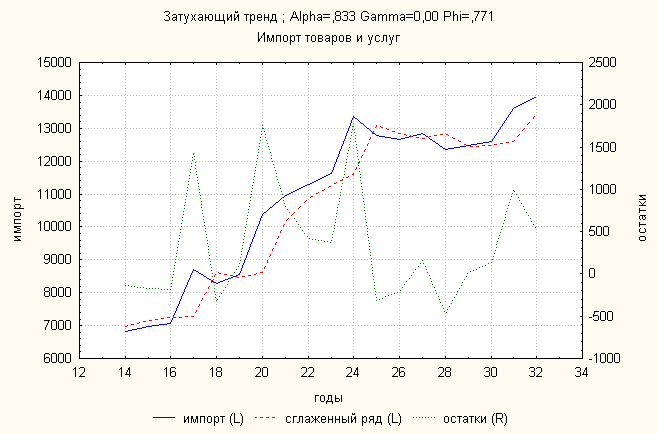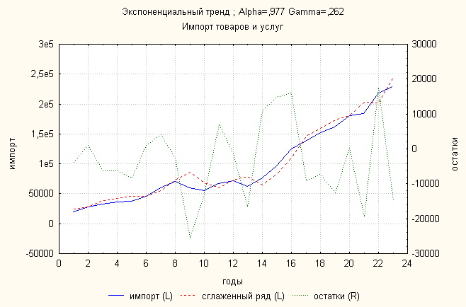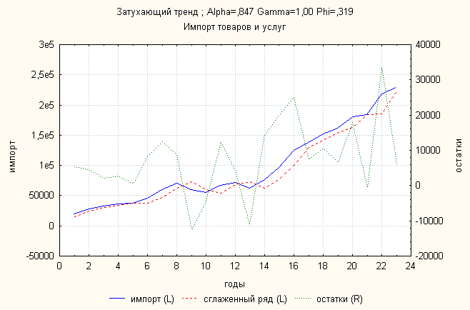 Ошибка 0,04 Анализ динамики импорта товаров и услуг показал, что затухающий тренд дает наименьшую ошибку. По нему делаем прогноз: