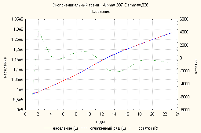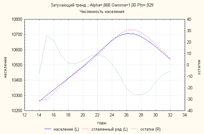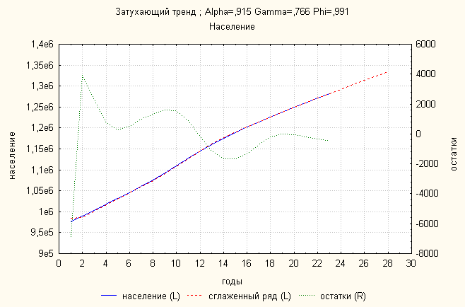 Ошибка 0,01183 Анализ динамики численности населения показал, что затухающий тренд дает наименьшую ошибку. По нему делаем прогноз:
