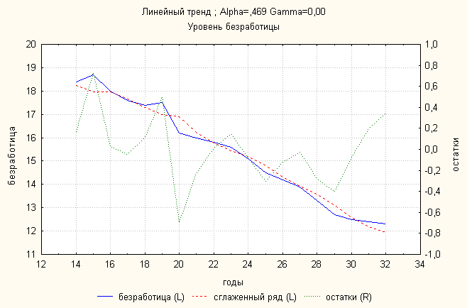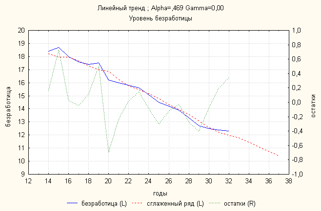 Ошибка 0,023 Анализ динамики уровня безработицы показал, что линейный тренд дает наименьшую ошибку. По нему делаем прогноз:
