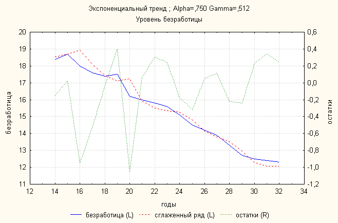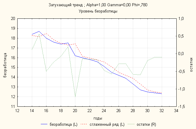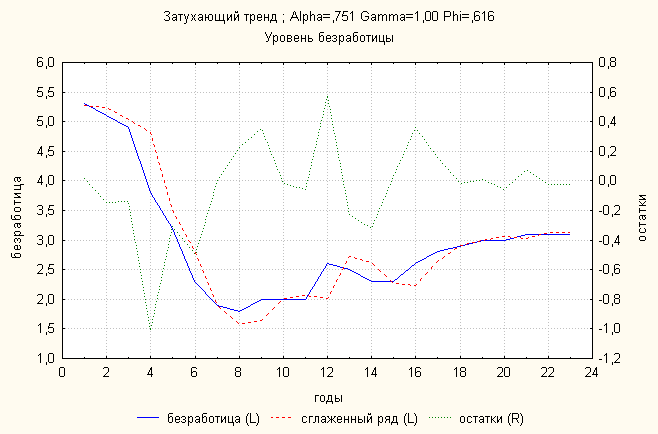 Ошибка 0,06 Анализ динамики уровня безработицы показал, что затухающий тренд дает наименьшую ошибку. По нему делаем прогноз:
