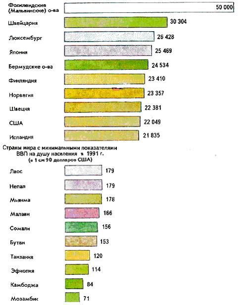 Рис.3. Страны мира с минимальными и максимальными показателями ВВП на душу населения. Структура экономики (соотношение секторов "первичного" сельское и лесное хозяйство, отрасли обрабатывающей промышленности, рыболовство; "вторичного" отрасли промышленности; "третичного"- услуги и сфера управления) находит свое отражение в Структуре ВВП и Структуре занятости экономически активного населения. Динамика ВВП за ряд лет дает представление о темпах экономического роста. Важными индикаторами при межстрановых сопоставлениях являются демографические показатели - средняя продолжительность предстоящей жизни мужчин и женщин, коэффициенты рождаемости и смертности (соответственно, количество родившихся и умерших на тысячу жителей), темпы прироста населения, численность и доля экономически активного населения, доля городского населения. Показатели, отражающие социальные аспекты жизни населения и "качество жизни": количество пациентов на одного врача, уровень грамотности (доля грамотного населения в численности населения страны), количество автомобилей на 100 семей и др., так же важны при экономико-географическом анализе. По всем этим показателям существуют весьма ощутимые различия между тремя группами стран.