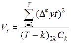 где RL – коэффициент автокорреляции с лагом L; Сx(L) = M[( где Сx(L) – автокорреляция лага L; M – значок математического ожидания; L – временный сдвиг (так же называемый лагом), L = 1,…T Cx(0) = M[( Для исключения тенденции используют различные методы – метод скользящей средней, метод конечных разностей. Ниже изложен метод конечных разностей. Он заключается в том, что последовательно находятся конечные разности. Остатки εt распределены приблизительно нормально, имеют среднюю 0 и дисперсию σ2. Основной проблемой является определение порядка разностей, при которых влияние тенденции исключено и разности следующего порядка определять не надо. Для этого определяют и сравнивают дисперсии.