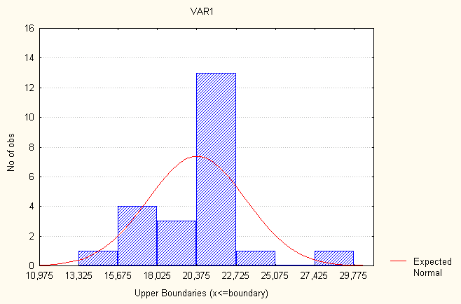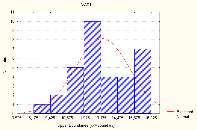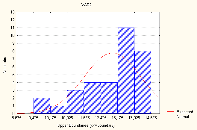 Рис. 7. Гистограмма распределения частот – распределение частот численности населения. Венгрия Рассмотрим показатель- распределение частот уровня рождаемости. Все значения данного показателя принадлежат отрезку [8,17500, 16,9250]. Разобьем отрезок [8,17500, 16,9250] на семь интервалов [(8,17500 - 9,42500); (9,42501 - 10,6750); (10,6751 - 11,9250); (11,9251 - 13,1750); (13,1751 - 14,4250); (14,4251 - 15,6750); (15,6751 - 16,9250)]. Определим число лет, попавших в каждый интервал, процент показавших в каждый, процент годов попавших в каждый интервал с учетом пропусков и накопленные проценты. В табл.8 представлено распределение частот. Таблица 8 Распределение частот