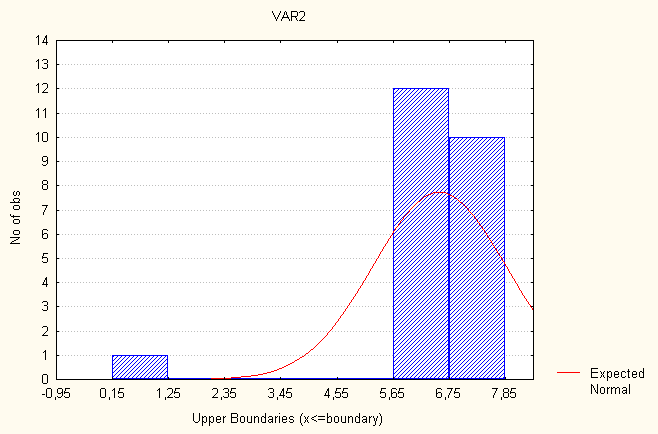 Рис. 2 Гистограмма распределения частот – распределение частот уровня рождаемости. Рассмотрим показатель- распределение частот уровня смертности. Все значения данного показателя принадлежат отрезку [0,150000, 7,85000]. Разобьем отрезок [0,150000, 7,85000] на семь интервалов [(0,150000, 1,25000); (1,25001, 2,35000); (2,35001, 3,45000); (3,45001, 4,55000); (4,55001, 5,65000); (5,65001, 6,75000); (6,75001, 7,85000)]. Определим число лет, попавших в каждый интервал, процент показавших в каждый, процент годов попавших в каждый интервал с учетом пропусков и накопленные проценты. В табл. 3 представлено распределение частот. Таблица 3 Распределение частот