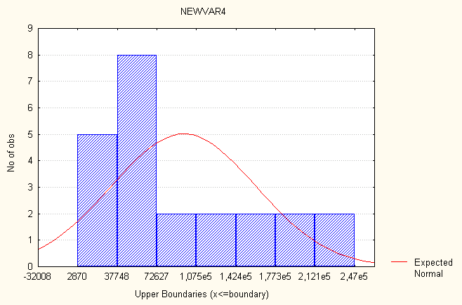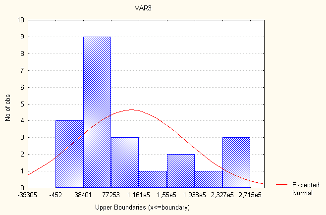 Рис. 3. Гистограмма распределения частот – распределение частот уровня смертности. Рассмотрим показатель- распределение частот экспорта товаров и услуг. Все значения данного показателя принадлежат отрезку [-451,76, 271515]. Разобьем отрезок [-451,76, 271515] на семь интервалов [(-451,76 - 38400,7); (38400,8 - 77253,2); (77253,3 - 116105); (116106 - 154958); (154959 - 193810); (193811 - 232663); (232664 - 271515)]. Определим число лет, попавших в каждый интервал, процент показавших в каждый, процент годов попавших в каждый интервал с учетом пропусков и накопленные проценты. В табл. 4 представлено распределение частот. Таблица 4 Распределение частот
