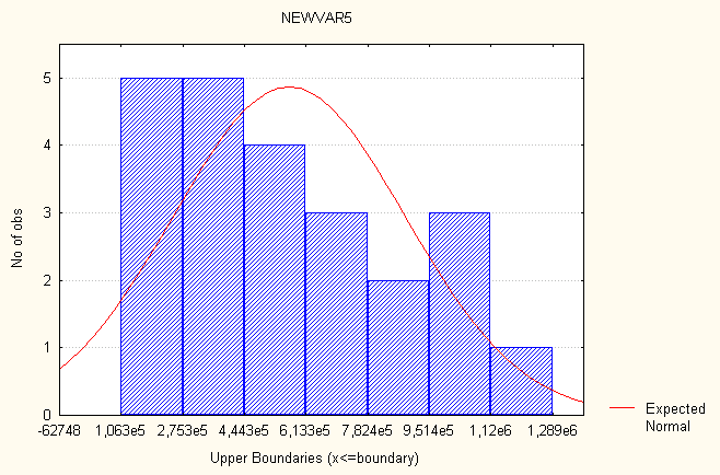 В третьей колонке показано количество лет, попавших в соответствующий интервал. В четвертой колонке процент годов, попавших в интервал. В пятой колонке проценты, подсчитанные с учетом отсутствующих значений. В последнем столбце показаны накопленные частости с учетом пропусков. На рис. 6 представлена гистограмма для показателя – распределение частот ВВП.