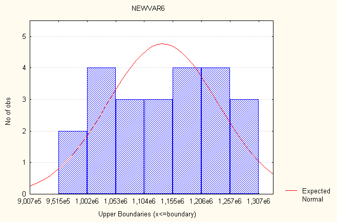 Рис. 6. Гистограмма распределения частот – распределение частот ВВП. Рассмотрим показатель- распределение частот численности населения. Все значения данного показателя принадлежат отрезку [951501, 1307447]. Разобьем отрезок [951501, 1307447] на семь интервалов [(951501 -1002351); (1002352 - 1053200); (1053201 - 1104049); (1104050 - 1154899); (1154900 - 1205748); (1205749 - 1256597); (1256598 - 1307447)]. Определим число лет, попавших в каждый интервал, процент показавших в каждый, процент годов попавших в каждый интервал с учетом пропусков и накопленные проценты. В табл. 7 представлено распределение частот. Таблица 7 Распределение частот