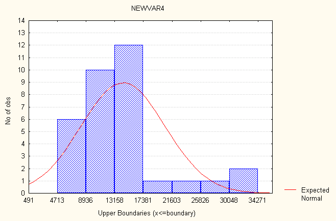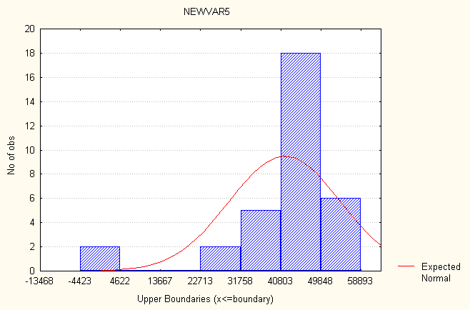 Рис. 9 Гистограмма распределения частот – распределение частот уровня смертности. Рассмотрим показатель- распределение частот экспорта товаров и услуг. Все значения данного показателя принадлежат отрезку [526,625, 31854]. Разобьем отрезок [526,625, 31854] на семь интервалов [(526,625 - 5001,97); (5001,98 - 9477,32); (9477,33 - 13952,6); (13952,7 - 18428,0); (18428,1 - 22903,3); (22903,4 - 27378,7); (27378,8 - 31854,0)]. Определим число лет, попавших в каждый интервал, процент показавших в каждый, процент годов попавших в каждый интервал с учетом пропусков и накопленные проценты. В табл. 10 представлено распределение частот. Таблица 10 Распределение частот