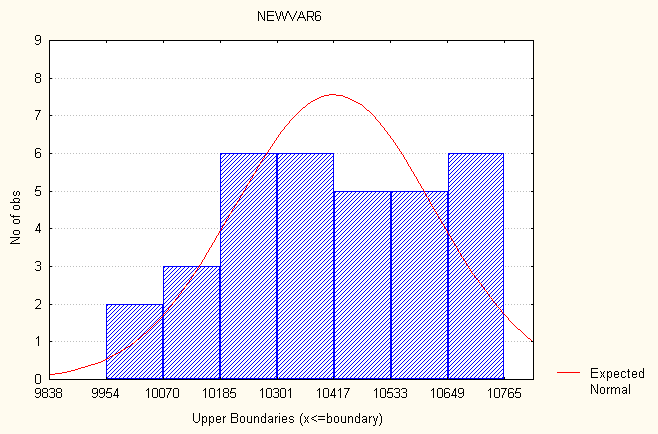 Рис. 12 Гистограмма распределения частот – распределение частот ВВП. Рассмотрим показатель- распределение частот численности населения. Все значения данного показателя принадлежат отрезку [9954,08, 10764,9]. Разобьем отрезок [9954,08, 10764,9] на семь интервалов [(9954,08 - 10069,9); (10070 - 10185,7); (10185,8 - 10301,5); (10301,6 - 10417,4); (10417,5 - 10533,2); (10533,3 - 10649,0); (10649,1 - 10764,9)]. Определим число лет, попавших в каждый интервал, процент показавших в каждый, процент годов попавших в каждый интервал с учетом пропусков и накопленные проценты. В табл. 13 представлено распределение частот. Таблица 13 Распределение частот