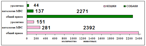 Структура заболеваемости собак и кошек в мегаполисе Из диаграммы 1 видно, что заболевания мочевыводящей системы собак и кошек встречались достоверно чаще, чем заболевания сердечно-сосудистой системы и дыхательного аппарата (p ≤ 0,01). 2.2.1.Частота встречаемости патологии мочевыводящих путей и уролитиаза у собак и кошек в условиях мегаполиса. На основании проведенных исследований установлена частота встречаемости заболеваний мочевыводящей системы у собак и кошек в условиях мегаполиса. Показано место уролитиаза в структуре заболеваний мочевыводящих путей и в общей структуре заболеваемости собак и кошек, что демонстрирует диаграмма 2. Диаграмма 2 Частота встречаемости патологии мочевыводящих путей и уролитиаза