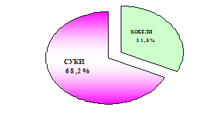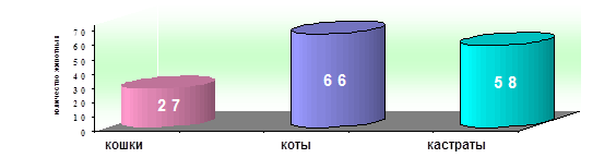 Из диаграммы 2 видно, что патология мочевыводящих путей выявлена у 11,8% обследованных кошек (281 из 2392). Заболевания мочевыводящей системы у собак диагностировали у 137 из 2271 животного, принятого амбулаторно, что составило 6 %. Таким образом, кошки более подвержены заболеваниям мочевыводящей системы, чем собаки (р ≤ 0,05). Заболеваемость уролитиазом кошек составила 6,3% (151 кошка из 2392 обследованных), собак - 1,9% (44 из 2271). Следовательно, кошки чаще собак болеют уролитиазом (p ≤ 0,001). Уролитиаз в группе заболеваний мочевыводящих путей кошек составил 53,7% (151 животное из 281 с патологий МВП), у собак доля уролитиаза в патологии мочевыделительной системы составила 32,1% (44 из 137 животных). Эти данные позволяют считать, что уролитиаз занимает одну из ведущих позиций в патологии мочевыводящих путей собак и кошек (p ≤ 0,001). Основными этиологическими факторами развития уролитиаза мелких домашних животных в условиях мегаполиса являлись: нарушения обмена веществ, обусловленные особенностями метаболизма, несбалансированным и нерациональным кормлением; гиподинамия; недостаточное поступление жидкости в организм; инфекции мочевыводящих путей; заболевания мочеполовой системы и желудочно-кишечного тракта и др. 2.2.2. Половая структура уролитиаза собак и кошек. Распределение уролитиаза по половому признаку в группе кошек, по материалам исследований, представлено на диаграмме 3 Диаграмма 3.