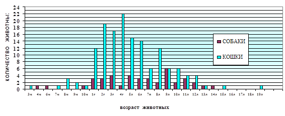 Из диаграммы 4 видно, что у самок уролитиаз проявлялся чаще, чем у самцов (р ≤ 0,01). Высокая частота встречаемости уролитиаза у сук, по данным исследований, обусловлена инфекцией мочеполовой системы. Так, в 60% проб урины сук кристаллурия сопровождалась бактериальной инфекцией, при чем, чаще бактериурия сопутствовала струвитному уролитиазу, что составило 50% от всех инфицированных проб мочи. У кобелей бактериурию выявили в 35,7% всех проб мочи с кристаллурией и только при трипельфосфатном типе уролитиаза. 2.2.3. Возрастные особенности уролитиаза собак и кошек. Анализ возрастных характеристик кошек и собак, заболевших уролитиазом в условиях мегаполиса, показал, что мочекаменную болезнь у этих животных регистрировали во всех возрастных группах, что иллюстрирует диаграмма 5. Диаграмма 5.