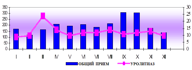 Возраст собак и кошек, больных уролитиазом в 2000 – 2002 гг. Из диаграммы 5 видно, что кошки наиболее часто болеют уролитиазом в возрасте от 1 года до 8 лет (77,5% от всех кошек, больных уролитиазом), с максимальным подъемом заболевания в возрасте 4 лет (р ≤ 0,01). У собак уролитиаз наиболее часто регистрировали в возрасте от 1 года до 10 лет (70,7% от всех исследованных собак с МКБ) (р ≤ 0,05) с наибольшим количеством случаев регистрации в возрасте 9 лет (р ≤ 0,05) и тенденцией к увеличению проявлений данной патологии в возрасте трех и пяти лет (периоды жизни соответствующие времени наивысшей половой активности). У собак и кошек в возрасте до года и старше одиннадцати лет заболевание встречается в виде единичных случаев. Сезонность проявлений уролитиаза Сезонность проявлений уролитиаза собак и кошек комнатного содержания в условиях мегаполиса демонстрируют графики 1 и 2. График 1.