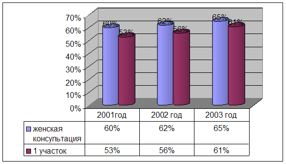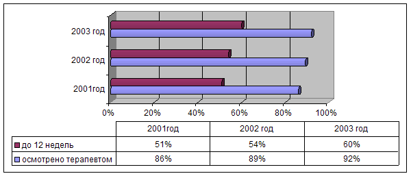 Анализ работы с беременными женщинами за 2001-2002-2003гг. Анализируя результаты работы с беременными женщинами, можно сделать следующие выводы: 1. За 2001-2003 года прослеживается отчётливая тенденция к увеличению количества родов (146-200). Это, несомненно, связано с некоторой стабилизацией социально-экономического положения в стране, а также увеличением количества повторнородящих в возрасте 30-39 лет, которые не реализовали детородную функцию в период 90-х годов. С другой стороны снизился процент первобеременных женщин, встающих на учёт по беременности (33,6%-32%). Количество женщин с ранней явкой на учёт по беременности за отчётный период увеличился с 53% до 61%. Процент беременных женщин, взятых на учёт в сроке 28 и более недель, остаётся примерно на одном уровне и составляет 6,9%-9,3%-6,5%. В большинстве случаев эта ситуация связана с социальным неблагополучием обслуживаемого населения. Доля женщин, закончивших беременность родами и не состоявших на учёте, за истекшие три года уменьшилась с 14% до 8,5%. В подавляющем большинстве случаев это женщины с низким прожиточным уровнем, женщины без гражданства и документов и повторнородившие женщины, которые в течение предыдущих беременностей также не состояли на учёте и благополучно родили. 2. Количество преждевременных родов снизилось с 6% до 4,7%. Этого удалось достичь благодаря введению программы по невынашиванию беременности, которая предусматривает этиотропное лечение угрозы прерывания, коррекцию нейроэндокринных нарушений с ранних сроков беременности, расширение возможности обследования и лечения ЗППП, а также появлению и широкому применению новых лекарственных препаратов в удобной таблетированной форме. 3. Все женщины, состоявшие на учёте по беременности, осмотрены терапевтом. Но, учитывая наличие женщин, не наблюдавшихся во время беременности, этот показатель составляет 86%-89,2%-91,5%. Процент женщин, осмотренных терапевтом до 12 недель, увеличился с 51% до 60%. Безусловно, этот показатель ниже общепринятого, но увеличение в процентном соотношении составляет 9%. Ниже представлена диаграмма с динамикой процента женщин, осмотренных врачом-терапевтом во время беременности. Процент женщин, осмотренных врачом терапевтом