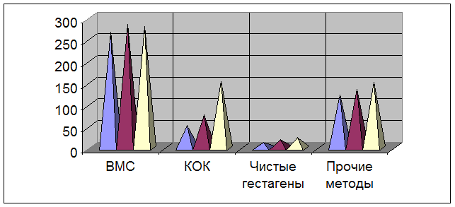 Методы контрацепции можно разделить на высокоэффективные (гормональные, внутриматочные, добровольную хирургическую стерилизацию и метод лактационной аменореи при определённых условиях) и низкоэффективные (барьерные, химические, ритмические, прерванный половой акт). Согласно представленным данным, примерно 30% женщин фертильного возраста применяют контрацептивные методы. В структуре методов на протяжении всех трёх лет преобладает внутриматочная контрацепция и прочие методы. С другой стороны, отмечается увеличение количества женщин, применяющих гормональную контрацепцию. Аборты. Проблема абортов в современных условиях занимает особое место. Распространённость и динамика абортов – показатели эффективности мер по охране репродуктивного здоровья.
