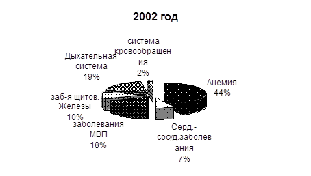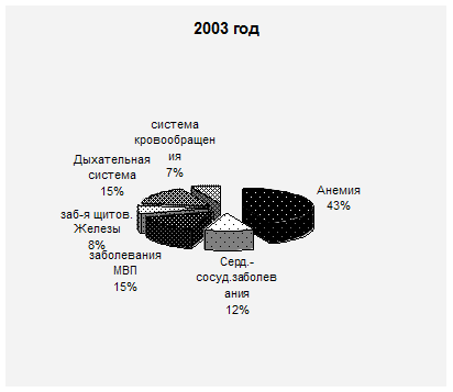 5. Выявление экстрагенитальной патологии во время беременности за 2001-2002-2003гг. увеличилось со 100% до 118%. В структуре заболеваний все три года на первом месте находится анемия; увеличилось количество заболеваний мочевыводящих путей (преимущественно за счёт пиелонефрита), болезней системы кровообращения. Ниже представлены диаграммы структурного соотношения выявленной экстрагенитальной патологии.