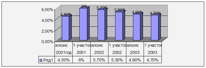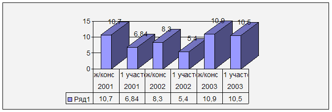 6. За период с 2001 по 2003 год снизилось количество случаев оперативного родоразрешения 19,1% до 16,9%, а также случаев осложнений в родах с 30,8% до 13,8% 7. Перинатальная смертность за 3 года повысилась с 6,84‰ до 10,5‰, но, несмотря на высокую концентрацию социально-неблагополучных женщин среди обслуживаемого населения, этот показатель практически равен областному показателю. Все случаи разобраны, ниже будут представлены краткие протоколы разборов. При анализе перинатальных потерь в сроке до 28 нед (из взятых на учёт по беременности) можно отметить снижение абортов по социальным показаниям, что объясняется введением в действие приказа МЗ РФ № 485 от 13 июня 2003 года, где существенно ограничены показания к прерыванию беременности по социальным показаниям. Сравнивая показатели по моему участку с показателями по женской консультации за 2001-2002-2003 гг., можно сделать следующие выводы: 1. Количество женщин с ранней явкой на учёт по беременности