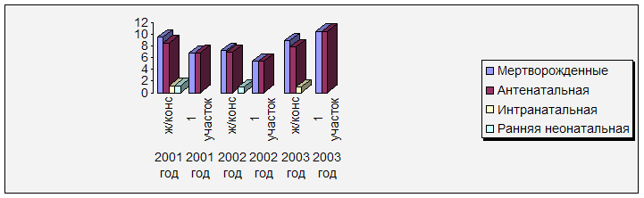 Уровень перинатальной и материнской смертности является основным интегрированным показателем, характеризующим эффективность охраны здоровья и качество оказания медицинской помощи женщинам и детям. При анализе представленной таблицы видно, что показатели перинатальной смертности на моём участке в 2001 и 2002 году ниже, чем по женской консультации, а в 2003 году практически равнозначны с показателями женской консультации. Следует отметить, что показатели перинатальной смертности по Тюменской области за 2003 год лишь незначительно ниже (9,2‰). К сожалению, данные по РФ доступны только за 2001 год, и можно отметить, что эти показатели выше данных по женской консультации и моему участку (12,9‰ по РФ; 10,7‰ по женской консультации и 6,84‰ по 1 участку) 4.Структура перинатальной смертности