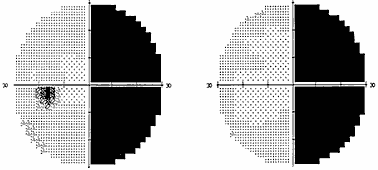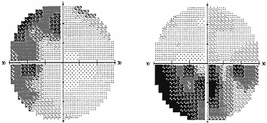 Рис. 1. Полная битемпоральная гемианопсия (автоматическая статическая периметрия) При наиболее часто встречающемся срединном варианте расположения хиазмы опухоль начинает сдавливать центральные перекрещенные волокна нижней поверхности хиазмы, идущие от носовых половин сетчатки. Клинически это проявляется появлением дефектов в верхних височных квадрантах поля зрения на обоих глазах – начальный хиазмальный синдром. Следует отметить, что дефекты в поле зрения поначалу можно выявить только с помощью цветных объектов, красного и зеленого. Исследование поля зрения на цвета более чувствительно, чем кинетическая периметрия на белый цвет. Острота зрения на этом этапе развития заболевания, как правило, сохраняется нормальной. Диски зрительных нервов обычной окраски. Постепенно, по мере роста опухоли, усугубляются битемпоральные дефекты поля зрения, начальный хиазмальный синдром переходит в развернутый хиазмальный синдром с полным или почти полным выпадением височных половин поля зрения. Появляется побледнение дисков зрительных нервов преимущественно в височной половине – развивается первичная нисходящая атрофия зрительных нервов. Важно знать, что изменения на глазном дне наступают спустя месяцы от момента развития первых дефектов поля зрения. Нередко, к сожалению, пациенты не фиксируют внимания на периферических дефектах в поле зрения и обращаются к офтальмологу только тогда, когда появляется понижение остроты зрения. Справедливости ради следует сказать, что порой и врачи не придают должного значения жалобам пациентов в случае сохранной остроты зрения и/или нормального диска зрительного нерва. Пациенты годами наблюдаются и лечатся у офтальмологов по поводу атрофии зрительного нерва. Понижение остроты зрения имеет место при воздействии опухоли на интракраниальный отрезок зрительных нервов, когда в процесс вовлекается папилло–макулярный пучок. Это происходит либо при непосредственном сдавлении зрительного нерва опухолью, либо в результате смещения его опухолью и придавливания нерва к серповидной связке или костным структурам интракраниального отверстия зрительного канала. Клинически симптом воздействия на интракраниальный отрезок зрительного нерва проявляется центральной или парацентральной скотомой. Но чаще это сочетается с периферическими височными дефектами поля зрения. Понижение остроты зрения возможно и в результате распространения височного дефекта поля зрения на центральную зону. Понижение остроты зрения может быть на одном или на обоих глазах. Сочетание понижения остроты зрения на одном глазу или на обоих, но разной степени выраженности, и битемпоральных дефектов поля зрения приводит к развитию асимметричного хиазмального синдрома, свидетельствующего об асимметричном росте опухоли. Понижение остроты зрения, которое появляется прежде или в относительно короткий срок после развития битемпоральных дефектов поля зрения, указывает на преимущественный рост опухоли кпереди – супраселлярно–антеселлярно или о заднем расположении хиазмы. При таком расположении хиазмы опухоль локализуется перед хиазмой, воздействуя в первую очередь или преимущественно на интракраниальные отрезки зрительных нервов. Внимание пациента также могут привлекать парацентральные битемпоральные скотомы. О