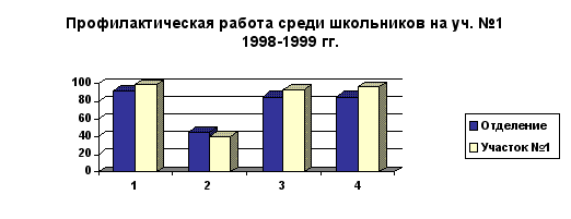 В школах имеются стационарные стоматологические кабинеты. Кабинет школы № 2 оснащен турбинной установкой УС-02, механическим креслом КЗ-2, воздушным стерилизатором ГП-23, стоматологическим инструментарием в достаточном количестве. В 1998 году совместными усилиями администрации школы и администрации области переоборудовала кабинет школы № 1 турбинной стоматологической установкой “Chiradent” (вместо УС-30). В кабинете имеется стоматологическое кресло КСЭМ-01, сухожаровой шкаф 2В-151. В обоих школах имеются амальгамосмесители АС-1. За отчётный период кабинеты школ №1 и №2 оснащены бактерицидными лампами, раковинами с 2 мойками. Имеются пломбировочные материалы, средства для лечения и профилактики стоматологических заболеваний, аптечки неотложной помощи. Стоматологическую помощь дошкольникам оказываю в передвижных кабинетах, укомплектованных на это время стоматологической установкой БС-10, креслом КСРД, сухожаровым шкафом 2в-151, инструментарием. В 1999 году в д/к №37 оборудован стоматологический кабинет, оснащённый стоматологической установкой УС-30, стоматологическим креслом КСЭМ-01, что позволило улучшить качество оказания стоматоло- гической помощи. Плановая санация проводится в основном в дни школьных каникул. Дети, социально запущенные, со сниженным интеллектом, с неустойчивой психикой, требующие особого внимания, приглашаются с родителями на санацию в школы. Анализ работы на участке № 1. Некоторые показатели работы на участке № 1 в сравнении со средними показателями профилактического отделения МУ «ДСП» за три года. Таблица 1