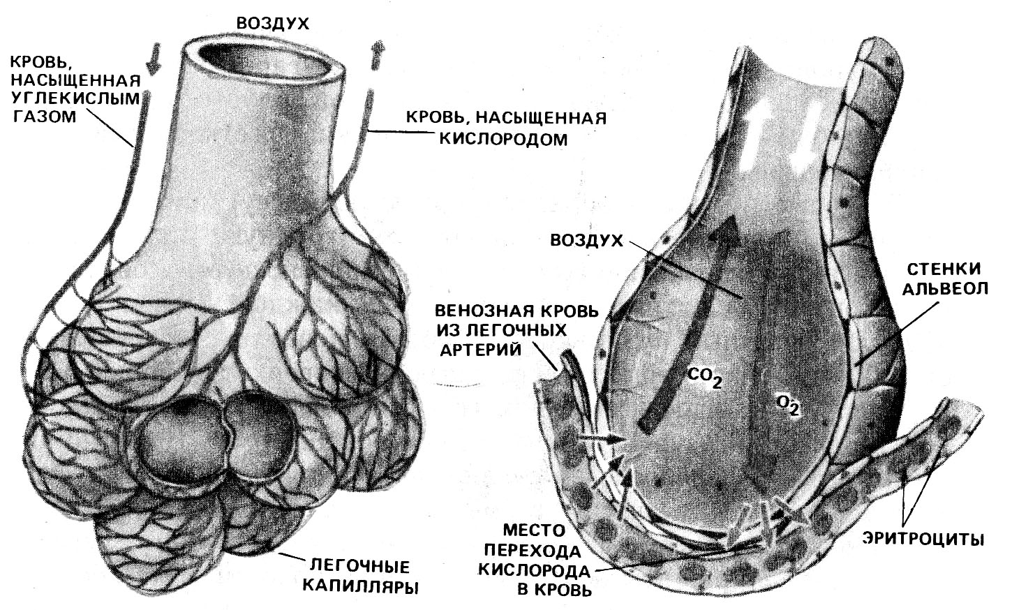 Легочные пузырьки (схема). Рисунок 2 тносительная величина поверхности, через которую в легких происходит газообмен, больше у животных с высокой активностью и подвижностью. Стенки альвеол состоят из одного слоя эпителиальных клеток и окружены легочными капиллярами. Внутренняя поверхность альвеолы покрыта поверхностно-активным веществом сурфактантом.Как полагают, сурфактант является продуктом секреции гранулярных клеток. Отдельная альвеола, тесно соприкасающаяся с соседними структурами, имеет форму неправильного многогранника и приблизительные размеры до 250 мкм. Принято считать, что общая поверхность альвеол, через которую осуществляется газообмен, экспоненциально зависит от веса тела. С возрастом отмечается уменьшение площади поверхности альвеол. Кровеносные сосуды легких.Легочная артерия несет кровь от правого желудочка сердца, она делится на правую и левую ветви, которые направляются к легким. Эти артерии ветвятся, следуя за бронхами, снабжают крупные структуры легкого и образуют капилляры, оплетающие стенки альвеол (рис. 2). Воздух в альвеоле отделен от крови в капилляре: