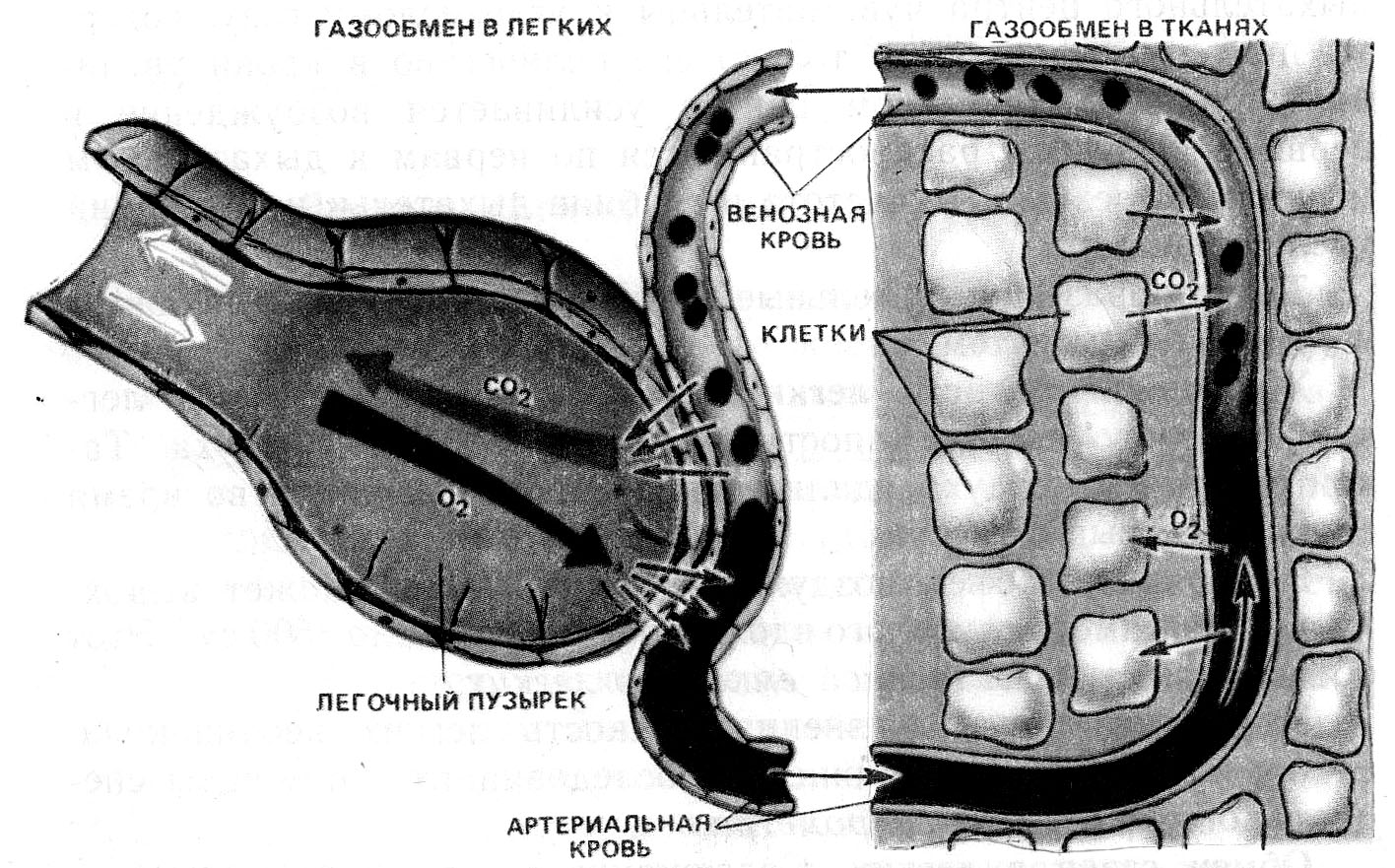 Газообмен в легких и тканях. Рисунок 3 ля вычисления тканевого Po2 созданы теоретически модели, которые предусматривают факторы, влияющие на поступление и потребление O2, а именно расстояние между капиллярами, кроваток в капиллярах и тканевой метаболизм.Самое низкое Po2 установлено в венозном конце и на полпути между капиллярами, если принять, что кроваток в капиллярах одинаковый и что они параллельны. Гигиена дыхания.Физиологии наиболее важные газы - O2, CO2, N2. Они присутствуют в атмосферном воздухе в пропорциях . Кроме того, атмосфера содержит водяные пары в сильно варьирующих количествах. С точки зрения медицины при недостаточном снабжении тканей кислородом возникает гипоксия. Краткое изложение разных причин гипоксии может служить и сокращенным обзором всех дыхательных процессов. Ниже в каждом пункте указаны нарушения одного или более процессов Систематизация их позволяет рассматривать все эти явления одновременно.