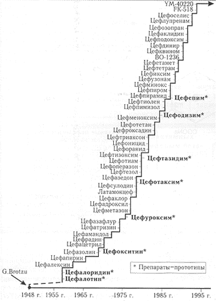 Реферат: Цефалоспорины: спектр активности, направления клинического примененияРеферат: Цефалоспорины: спектр активности, направления клинического примененияСодержание- Введение - Химическая структура цефалоспоринов - Механизм действия цефалоспоринов - Механизмы формирования резистентности к цефалоспоринам - Классификация цефалоспоринов - Фармакология цефалоспоринов - Цефалоспорины 1-го поколения - Цефалоспорины 2-го поколения - Цефалоспорины 3-го поколения - Цефалоспорины 4-го поколения - Побочные эффекты цефалоспоринов - Список используемой литературы ВведениеСоздание и внедрение в клиническую практику антибиотиков класса цефалоспоринов явилось, безусловно, одним из важнейших событием в истории химиотерапии бактериальных инфекции. В настоящее время, очевидно, что по ряду важнейших параметров: спектру антибактериального действия, фармакокинетике, безопасности и др., цефалоспорины превосходят антибиотики многих других классов, чем и объясняется их статус антибактериальных средств, наиболее широко применяемых во многих странах мира. Рождение цефалоспоринов справедливо связывают с работами G.Brotzu, предположившего в начале 40-х годов, что периодическое самоочищение сточных вод в Сардинии обусловлено ингибирующей активностью особых микроорганизмов. В 1945 г. ему удалось выделить гриб Cephalosporium acremonium (в настоящее время именуемый Acremonium chrysogenum), обладавший выраженной антибактериальной активностью по отношению к грамположительным и грамотрицательным микроорганизмам. Следующим этапом (с 1955 по 1962 г.) явилось детальное изучение С.acremonium рабочими группами H.Florey и E.P.Abraham. Из продуктов обмена веществ этого гриба удалось выделить бактерицидную субстанцию - цефалоспорин С, ставшую исходным веществом для получения 7-аминоцефалоспорановой кислоты - структурной основы цефалоспоринов. В 1962 г. в клиническую практику был введен первый антибиотик класса цефалоспоринов - цефалоридин, однако широкое клиническое применение цефалоспоринов началось только в конце 70-х годов. В настоящее время насчитывается более 50 цефалоспоринов (рис. 1), поэтому нет ничего удивительного в том, что врач испытывает немалые затруднения при выборе нужного препарата в соответствии с показаниями. В связи с этим целью настоящей лекции является объективная оценка возможностей цефалоспоринов в современной клинической практике.