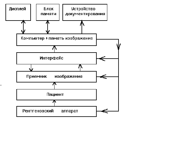 Рис.3 Принципиальная схема взаимодействия элементов системы получения, обработки, хранения и передачи рентгеновских диагностических изображений. Число градаций в изображении зависит от медицинского назначения. Аналого-цифрового преобразования на 8 бит, обеспечивающего точность 0,4%, вполне достаточно для регистрации зашумленных изображений или больших массивов (меньшей ступени градации яркости соответствует больший уровень шума), однако для ряда приложений может понадобиться и 10-битовый АЦП (точность 0,1%). Если требуется быстрый доступ к информации, полученной за длительный период времени, целесообразно применять оптические диски. Емкость памяти 12-дюймового оптического диска равна примерно 2 гигабайт, что соответствует 1900 изображениям размером 1024х1024 по 8 бит каждое (без сжатия данных). Для считывания с оптического диска может быть использовано автоматическое устройство съема, позволяющее обеспечить быстрый доступ к любому изображению. Возможность работы со всеми изображениями в цифровой форме весьма привлекательна, а системы, выполняющие это, называются системами хранения и передачи изображения (СПХИ). На рис.3 изображена принципиальная схема взаимодействия элементов системы получения, обработки, хранения и передачи рентгеновских диагностических изображений. Система представлена тремя каналами: