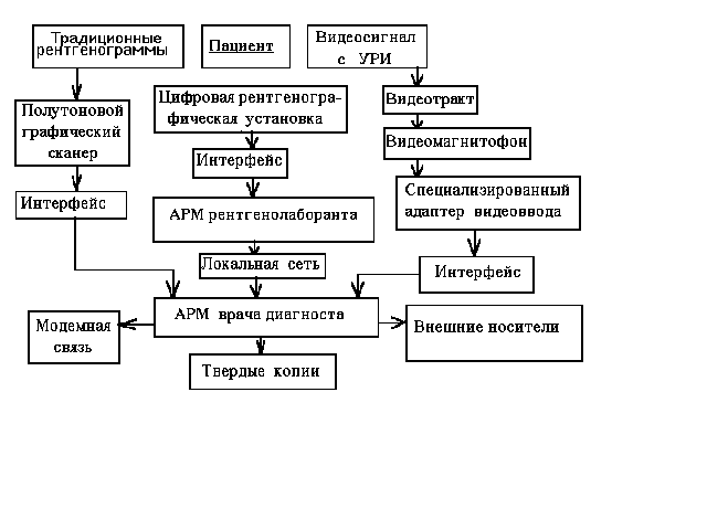 Первый канал. Рентгенограммы, полученные с помощью традиционного процесса, поступают на обработку в полутоновый графический сканер, с помощью которого рентгенодиагностическое изображение вводится в память компьютера. После этого такая преобразованная рентгенограмма может обрабатываться средствами компьютерной техники, но в рамках узкого динамического диапазона рентгеновской пленки. Это изображение может быть введено в электронный архив и извлекаться оттуда по требованию. Эта оцифрованная рентгенограмма уже ничем не отличается от прямых цифровых рентгенограмм по доступности средствам обработки. Третий канал. Рентгеновские изображения из рентгенотелевизионного канала УРИ могут захватываться специализированным адаптером видеоввода как в режиме реального времени, так и с видеомагнитофонного кадра. Последнее предпочтительно, так как позволяет при просмотре видеомагнитофонных изображений выбрать нужный кадр для занесения его в архив. Объектом ввода в электронный архив могут быть любые изображения, получаемые при рентгеноскопии с помощью УРИ. Первый и третий каналы дают возможность преобразовать традиционные рентгеновские изображения (рентгенограммы и кадры видеотелевизионного тракта) в цифровое изображение. Этот прием имеет особое значение, потому что он представляет возможность достоверно сравнить изображения, полученные различными способами. Следующим преимуществом преобразования являются возможность помещения его в электронный архив и выполнение всех операций с цифровым изображением. Следует особенно подчеркнуть возможность передачи изображения по компьютерным сетям, потому что в последние годы "взгляды медиков фокусируются на передачe изображений" как основном средстве обеспечения доступа к материалам, что имеет колоссальное значение как для диагностики, так и для процессов обучения. Второй канал. Это собственно канал цифровой рентгенографической установки. Он состоит из двух подсистем: автоматизированного рабочего места (АРМ) лаборанта и АРМ врача-рентгенолога (ВР), объединенных в локальную сеть. В АРМ рентгенолаборанта происходит внесение сведений о больном, необходимых организационных и клинических данных и управление процессом регистрации изображения (синхронное включение сканера и высокого напряжения и др.). После получения рентгеновского изображения оно и сведения о пациенте по локальной сети поступают в АРМ ВР. При этом процесс рентгенографии и передачи изображений от АРМ лаборанта в АРМ врача происходит без промедлений и в реальном времени, не прерывая работы врача ни на одной ступени, т.е. происходит непрерывная и независимая работа на обоих рабочих местах. На АРМ ВР выполняются программная обработка изображений для извлечения диагностической информации, поиск предшествующих изображений пациентов и сравнение с вновь полученными, регистрация новых пациентов и изображений в базе данных, приведение их к формату, оптимальному для архивирования, и другие манипуляции, доступные электронным технологиям персонального компьютера. Программное обеспечение позволяет врачу-рентгенологу при необходимости и создать твердые копии изображений на лазерном принтере ( этот способ получения твердых копий несколько уступает в точности передачи диагностических изображений теплопечат