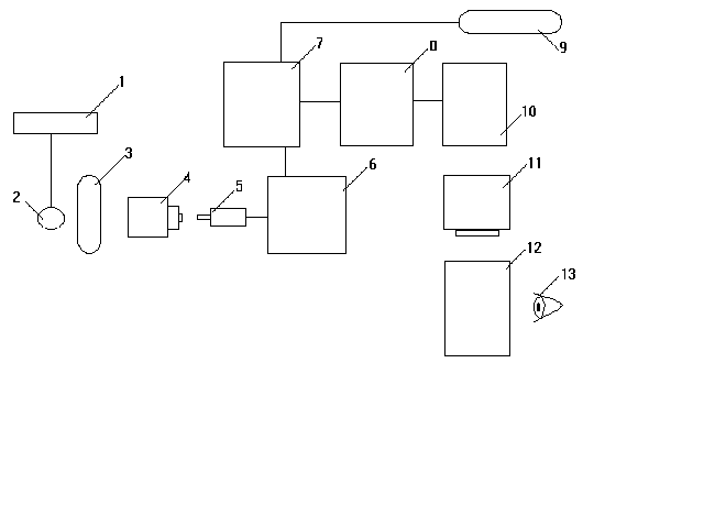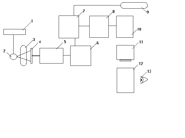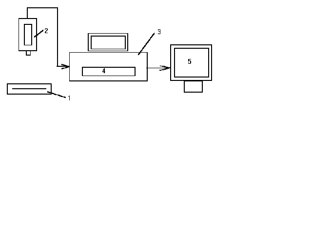 Рис.4 Блок-схема технических средств АРМ ВР. 1-негатоскоп; 2-телевизионная камера; 3-ПЭВМ; 4-фрейм-граббер; 5-телемонитор. Практическая работа показала, что производительность персонального компьютера во многих случаях достаточна, чтобы решать задачи обработки видеоданных в реальном времени врача. Кроме того ПЭВМ имеют мощные технические и программные средства для организации "оконного" человеко-машинного диалога. При использовании изображений, записанных в аналоговом виде, например рентгенограмм, необходимо устройство для ввода и визуализации их в ЭВМ. В качестве такого устройства удобно использовать фрейм-граббер конструктивно оформленный в виде платы, расположенной в корпусе ПЭВМ. Также необходимо иметь телекамеру с объективом, световой стол для подсветки рентгенограмм (негатоскоп) и телемонитор для визуализации изображений (рис.4). Устройство цифрового ввода и визуализации изображений должно обеспечивать высокое качество представления медицинских изображений, чтобы при их использовании не терялась важная диагностическая информация. ЦИФРОВАЯ РЕНТГЕНОГРАФИЯ С ЭКРАНА ЭЛЕКТРОННО-ОПТИЧЕСКОГО ПРЕОБРАЗОВАТЕЛЯ (ЭОП)Система рентгенографии с экрана ЭОП (рис. 5) состоит, как и обычная система электронно-оптического преобразования для просвечивания, из ЭОП, телевизионного тракта с высоким разрешением, рентгеновского высоковольтного генератора и рентгеновского излучателя