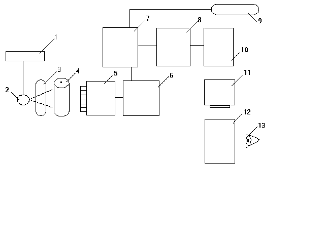 Рис. 6 Цифровая люминисцентная рентгенография. 1-генератор; 2-рентгеновская трубка; 3-пациент; 4-запоминающая пластина; 5-транспортирующее устройство; 6-аналого-цифровой преобразователь; 7-накопитель изображений;8-видеопроцессор; 9-сеть; 10-цифро-аналоговый преобразователь; 11-монитор; 12-снимок; 13-рентгенолог. После цифрового усиления контуров и контрастности элементов изображения оно лазерным принтером печатается на пленке или воспроизводится на телевизионном мониторе рабочей консоли. Люминесцентные пластины-накопители выпускаются в стандартных формах рентгеновской пленки, помещаются вместо обычных комплектов "пленка—усиливающий экран" в кассету и применяются в обычных рентгеновских аппаратах. Такая пластина обладает значительно большей экспозиционной широтой, чем общепринятые комбинации пленка-экран, благодаря чему значительно расширяется интервал между недо- и переэкспонированием. Этим способом можно получать достаточно контрастные изображения даже при резко сниженной экспозиционной дозе, нижним пределом которой является лишь уровень квантового шума. Поэтому даже при рентгенографии в палате у постели больного методика ЦЛР гарантирует получения качественного снимка. При ЦЛР используются цифровые преобразователи, пространственное разрешение которых выше, чем у большинства используемых в настоящее время для обычной рентгенографии комбинаций экран-пленка. Все же особым преимуществом ЦЛР является передача малоконтрастных деталей, тогда как передача очень мелких деталей, таких, например, как микрокальценаты в молочной железе, остается прерогативой рентгенографии на рентгеновской пленке. СЕЛЕНОВАЯ РЕНТГЕНОГРАФИЯ