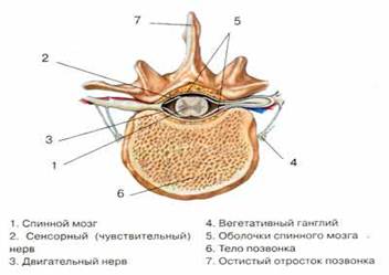 Спинной мозг расположен в полости позвоночного канала, окружен тремя оболочками и укреплен связками. Он начинается на уровне верхнего края первого шейного позвонка и продолжается до 1-2-го поясничных позвонков. С помощью комплексов отростков нервных клеток спинной мозг связан с головным. Связь спинного (а, соответственно, через него и головного) мозга с кожей, опорно-двигательным аппаратом и внутренними органами осуществляется также с помощью отростков нервных клеток, которые при выходе из спинного и головного мозга переплетаются друг с другом, образуя корешки, нервные сплетения, нервные стволы, спинно-мозговые нервы (см. рис. 4). Совокупность этих нервных образований и их многочисленных разветвлений выделена в периферическую нервную систему.