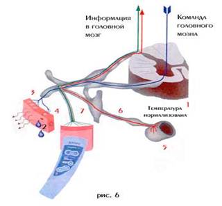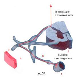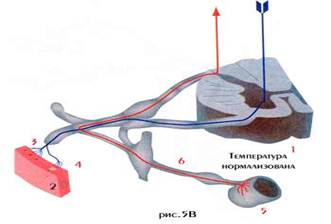 Например, в случае повышения температуры тела по внешним (жаркая погода) или внутренним (инфекция) причинам не происходит перегревания организма с нормальными приспособительными возможностями по следующему механизму. Интерорецепторы регистрируют предельное повышение внутренней температуры, опасное для жизнедеятельности организма. Информация об этом в виде электрических импульсов по афферентным путям поступает в центральную нервную систему (см. рис. 5А).