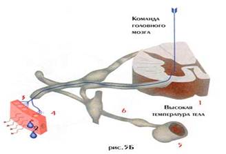 В центральной нервной системе полученная информация анализируется, принимается решение, и команда для выполнения этого решения передается на исполнительный участок мозга, откуда в виде электрического импульса по эфферентным проводящим путям поступает к органам-исполнителям. Получив команду, кожные кровеносные сосуды расширяются, а потовые железы начинают активно работать (рис. 5Б).