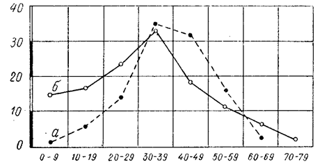 Рис. 1. Распределение по возрасту больных опухолью спинного мозга.(1) а — повозрастное распределение,населения, б — повозрастное распределение больных опухолью спинного мозга. Локализация опухолей по длиннику спинного мозга (1)