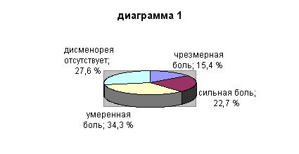 Как показано на диаграмме 1, наиболее часто встречаются случаи умеренной боли с незначительным общим недомоганием. При этом работоспособность женщины нарушается редко, и уровень жизненной активности практически не снижается. Однако стоит заметить, что подобная достаточно легкая форма дисменореи без своевременного медицинского вмешательства может со временем перерастать в более тяжелую, связанную с усилением недомогания и продолжительностью болезненных состояний. Вторым по степени распространенности является случай, для которого характерны сильные боли внизу живота, общая слабость, а также такие симптомы, как тошнота, головные боли, частое мочеиспускание, озноб. Кроме того, женщина может испытывать чувство тревоги, депрессии, становиться раздражительной. У многих больных этой формой дисменореи (альгоменореи) наблюдается бессонница, непереносимость различных запахов, повышенный аппетит. Работоспособность заметно нарушается, и часто в подобных случаях необходим прием соответствующих лекарственных средств, подобранных исключительно с помощью специалиста. И наконец третья, реже встречающаяся, степень дисменореи (альгоменореи, болезненных менструаций) проявляется в ощущении чрезмерной боли в области живота и поясницы, резко выраженной общей слабости, сильных головных болях. Часто повышается температура, бывает рвота, диарея, боли в сердце, тахикардия, нередки обмороки. В подобном состоянии активность снижается практически до нуля, а прием обезболивающих (например, анальгетиков) не дает никакого эффекта, еще больше травмируя ослабленный организм женщины. Столь тяжелая форма дисменореи (альгоменореи, болезненных месячных) может быть связана с врожденными аномалиями половых органов (например, удвоенная матка и др.), которые диагностируются при УЗИ и требуют консультации врача-гинеколога. В целом же, основной причиной дисменореи (альгоменореи, болезненных менструаций) на современном этапе считается нарушение синтеза гормональных веществ. Это приводит к чрезмерной концентрации гормона простагландина в организме, что особенно болезненно для молодых женщин в возрасте от 13-14 до 23-25 лет. Данный вид заболевания, возникающий из-за гормональных сбоев, называется первичной дисменореей и лечится, как правило, приемом лекарственных средств типа анальгетиков или прогестиновых препаратов. Для облегчения болезненных состояний также возможен прием комбинированных оральных контрацептивов. Во время лечения врачи нашего центра рекомендуют вести менструальный календарь и примерно раз в два месяца консультироваться у специалиста. Между тем, у женщин более старшего возраста (после 30 – 35 лет) болезненные ощущения и недомогание во время месячных могут являться симптомами таких гинекологических заболеваний, как эндометриоз, миома матки, аденомиоз, различные воспаления тазовых органов, поэтому на болезненные менструации нужно обращать очень серьезное внимание. Подобная симптоматика должна служить мотивом для немедленного посещения гинеколога, особенно если вы у него никогда не были. Болезненные ощущения и недомогание во время месячных у женщин после 30 – 35 носит название вторичной дисменореи и, как правило, требует более тщательного обследования, которое назначается специалистами нашего медицинского центра индивидуал