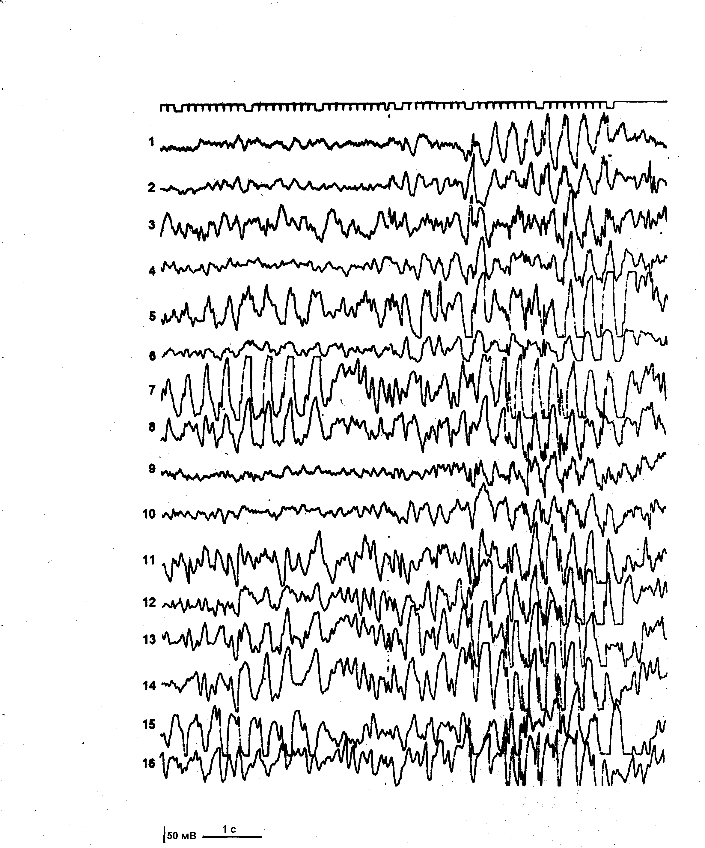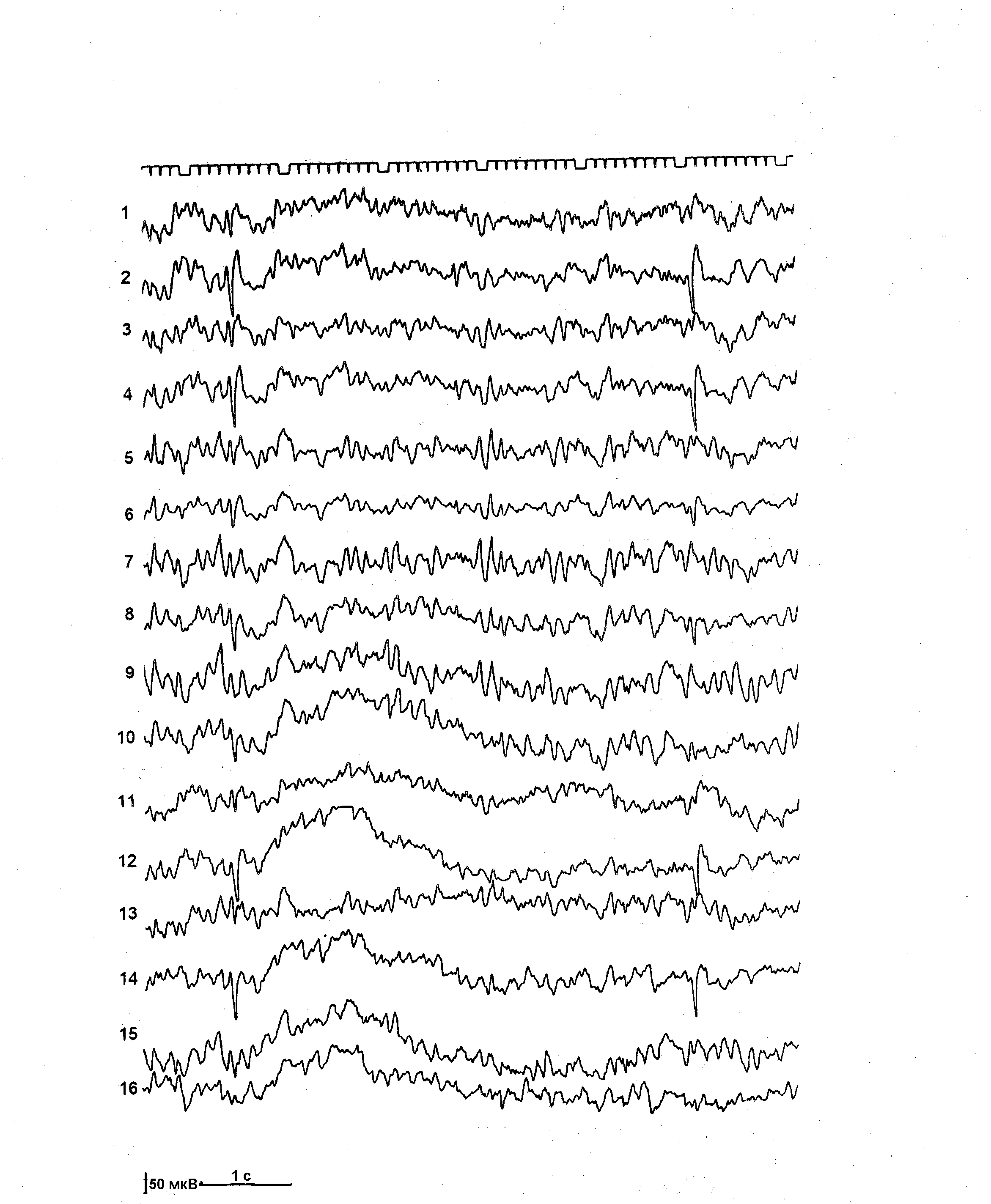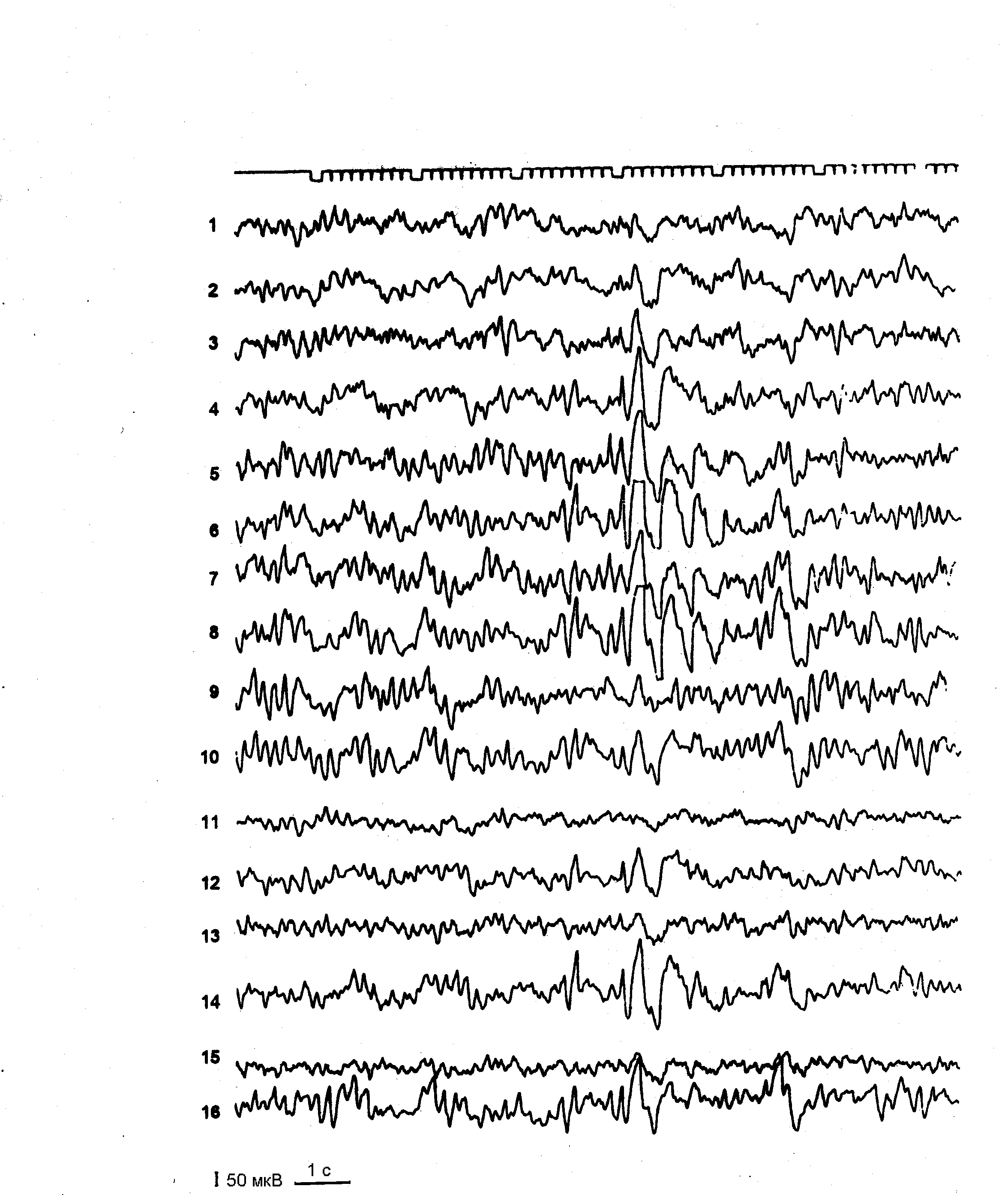 1-16 – отведения: 1 – правое лобное; 2 – левое лобное; 3 – правое лобно-центральное; 4 – левое лобно-центральное; 5 правое центрально-теменное; 6 – левое центрально-теменное; 7 – правое теменно-затылочное; 8 – левое теменно-затылочное; 9 – правое лобно-височное; 10 – левое лобно-височное; 11 – правое центрально-височное; 12 – левое центрально-височное; 13 – правое теменно-височное; 14 – левое теменно-височное; 15 – правое височно-затылочное; 16 – левое височно-затылочное. гипертермию. Донозологический период эпилепсии продолжался около 11 месяцев и закончился после второго неспровоцированного парциального судорожного припадка с вторичной генерализацией. Обращает на себя внимание период параллельного развертывания фебрильных и афебрильных припадков, а также появление фебрильных припадков на субфебрильные значения температуры тела в конце донозологического периода эпилепсии. Эпилептический синдром в донозологическом периоде эпилепсии выявлен у 69 (15%) больных. Основным критерием эпилептического синдрома считали текущее органическое заболевание мозга в остром или восстановительном периоде, в клинической картине которого имели место единичные (55%) или повторные (45%) эпилептические припадки. У 87% больных припадки были генерализованными судорожными и у 13% парциальными. У всех больных припадки являлись мономорфными. Основное количество наблюдений (54) составили дети, которые на первом году жизни находились в раннем или позднем восстановительном периоде перинатальной энцефалопатии, и имели эпилептические припадки. Далее следовали заболевания энцефалитами (8) и дети с черепно-мозговой травмой (7). Данная группа наблюдений не содержит больных с рецидивами или первичным проявлением эпилептических припадков в периоде остаточных явлений или последствий выше названных заболеваний. Так, например, поздний восстановительный период перинатальной энцефалопатии, еще дававший основания диагностировать эпилептические припадки в качестве эпилептического синдрома, считали законченным у доношенных детей в возрасте 12 мес. и при недоношенности различной степени - в возрасте 18-24 мес. Продолжительность восстановительного периода у больных энцефалитами и черепно-мозговой травмой исчисляли в 2 года. Клинические варианты перинатальной энцефалопатии с эпилептическим синдромом и конечным исходом в олигофрению, гидроцефалию и детский церебральный паралич, были так же исключены из данной группы наблюдений, несмотря на персистирование у этих больных эпилептических припадков в силу того, что в итоге, диагноз эпилепсии в этих наблюдениях не был поставлен. В данную группу наблюдений вошли 9 больных с исходом синдрома Веста. По последней международной классификации эпилепсии 1989г. синдром Веста рубрифицируется в качестве клинического варианта эпилепсии у детей грудного возраста. Однако в связи с выявлением у этих больных прямой связи заболевания с воздействием тяжелых факторов риска по перинатальной патологии мозга (асфиксия, позднее оперативное родоразрешение и др.) и диагностированием энцефалопатии в периоде новорожденности, в настоящем исследовании синдром Веста рубрифицирован в качестве эпилептического синдрома перинатальной энцефалопатии согласно приведенным выше критериям. Кроме эпилептических припадков, в анамнезе больных этой груп