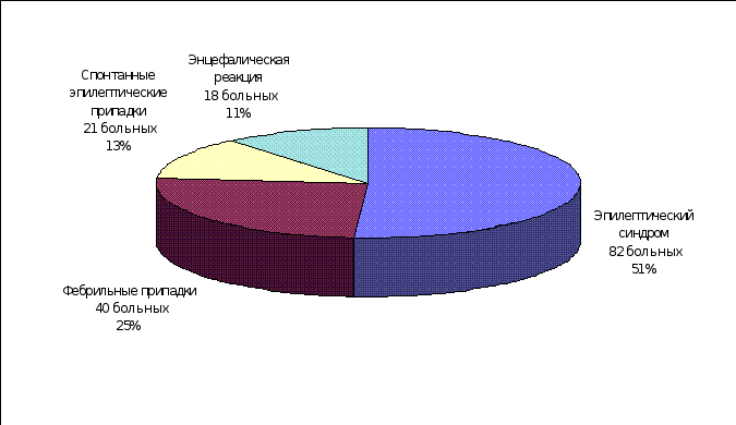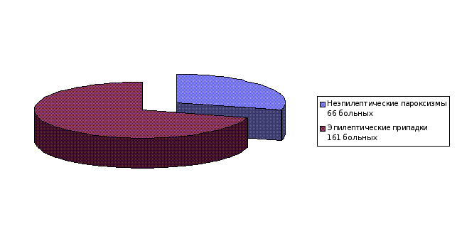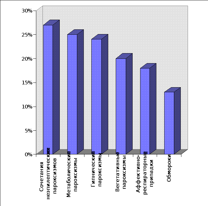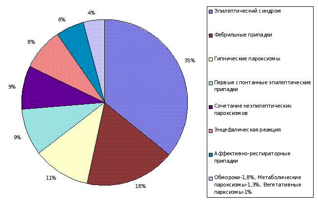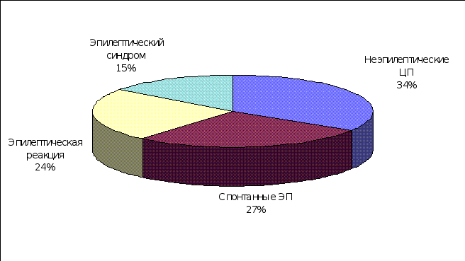 Приведенная классификация достаточно активно используется в научных исследованиях, однако не получила широкого распространения в повседневной клинической практике, в которой чаще применяются исторически сложившиеся названия ЦП, например: мигрень, обмороки, фебрильные припадки и др., и где традиционно все ЦП делятся на эпилептические и неэпилептические, судорожные и бессудорожные. Классификация ЭП регулярно подвергается пересмотру международным сообществом эпилептологов. Кроме того, в практической эпилептологии широко применяется и систематизация патологических состояний сопровождающихся ЭП по принципу основного патологического процесса, изложенная в терминологическом словаре по эпилепсии [Gastaut H., 1975] и подробно разработанная А.И. Болдыревым [1984] и др. Она содержит несколько разновидностей патологических состояний, в рамках которых следует идентифицировать ЭП: спонтанные случайные припадки, эпилептическую реакцию, эпилептический синдром и эпилепсию (эпилептическую болезнь). Первые три рубрики предполагают как единственные в жизни, так и повторные ЭП у человека еще не болеющего эпилепсией и четвертая – только повторные спонтанные ЭП. Данная систематизация хороша тем, что в определенной степени объективно отражает этапность и обратимость эпилептогенеза, процесс формирования эпилепсии, занимающий определенное время и позволяет смело утверждать, что далеко не у каждого ребенка однократное, а иногда и повторное развертывание ЭП означает, что этот ребенок уже болен эпилепсией или непременно заболеет ею в будущем. Вот почему частота единичных ЭП в детской популяции на порядок превышает частоту собственно эпилепсии. Что касается неэпилептических ЦП, то в настоящее время их чаще называют по основным клиническим проявлениям, например: «ночные страхи», «ларингоспазм», «гипогликемические судороги» и др., либо исторически сложившимися названиями «нарколепсия», «обмороки» и др. В качестве названия неэпилептических ЦП был предложен термин «псевдоприпадки» подчеркивающий их неэпилептическую природу [Betts T., King D.W. et all., 1982$ Schmitt J., 1979]. Исследованию частоты неэпилептических ЦП у детей долгое время не уделялось должного внимания в связи с господствовавшими консервативными представлениями об их исключительной доброкачественности и благоприятном прогнозе. В последнее время, в связи с возросшим интересом к неврологии ЦП вообще и появившимися фактами, указывающими на возможность преемственной связи неэпилептических ЦП с развитием в последующем у этих больных эпилепсии, таковые статистические данные начинают появляться. Например, аффективно-респираторные припадки наблюдаются у детей в возрасте до 4 лет с частотой от 9,3% до 13% [Lehovsky M., 1979], обмороками страдают до 6,8% детей [Акимов Г.А., Ерохина Л.Г., Стыкан О.А., 1987] и неэпилептическими парасомниями – свыше 18% детей и подростков [Бибилейшвили Ш.Н., 1975; Болдырев А.И., 1987; Hallstrom T., 1972 и др.]. Среди неучтенных классификацией Гасто в детском возрасте часто встречаются и другие, весьма многочисленные вегетативно-сосудистые и вегетативно-висцеральные ЦП, диагностируемые в рамках «невроза», «псевдоневроза», «вегетативной дистонии», «гипоталамического», «психо-вегетативного» синдромов и др. Приводим материал собственных наблюдений ЦП у детей. Из рисунка 2. следует, что основной клинич