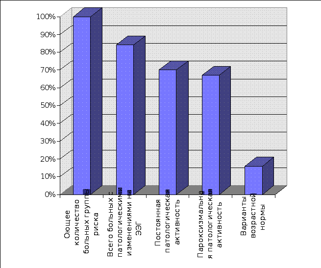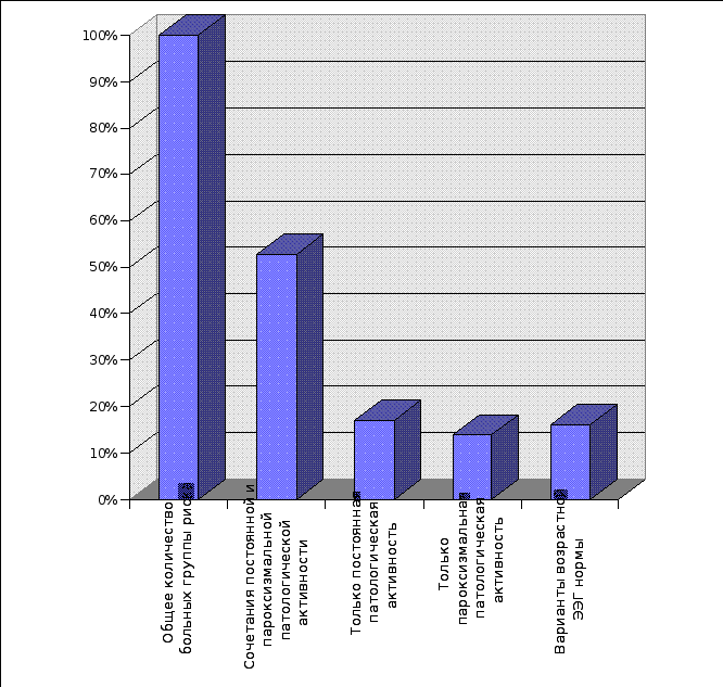 У 120 больных, что составило 52,8% наблюдений группы риска, церебральные пароксизмы донозологического периода эпилепсии развертывались в условиях ЭЭГ признаков органического повреждения и дисфункции срединных структур мозга. Основанием для подобного суждения явилось сочетание у этих больных постоянной патологической, преимущественно медленной ЭЭГ активности и патологической пароксизмальной активности. В целом, результаты ЭЭГ исследования больных находящихся в донозологическом периоде эпилепсии указывали на органическое повреждение и нарушение функционального состояния структур лимбической коры, диэнцефалона и неспецифических систем ствола мозга. ЭЭГ феноменами, указывающими на органическое повреждение этих структур, считали преимущественно постоянную патологическую ЭЭГ активность и признаки запаздывания церебрального электрогенеза, выявленные у 70% больных группы риска. Они расценивались нами в качестве неспецифичных для собственно эпилепсии в любом периоде развития заболевания, являлись ЭЭГ выражением органического повреждения мозга, перенесенного в периоде беременности, родов, либо в постнатальной жизни ребенка и указывали на топический диагноз заболевания. На изменение функционального состояния