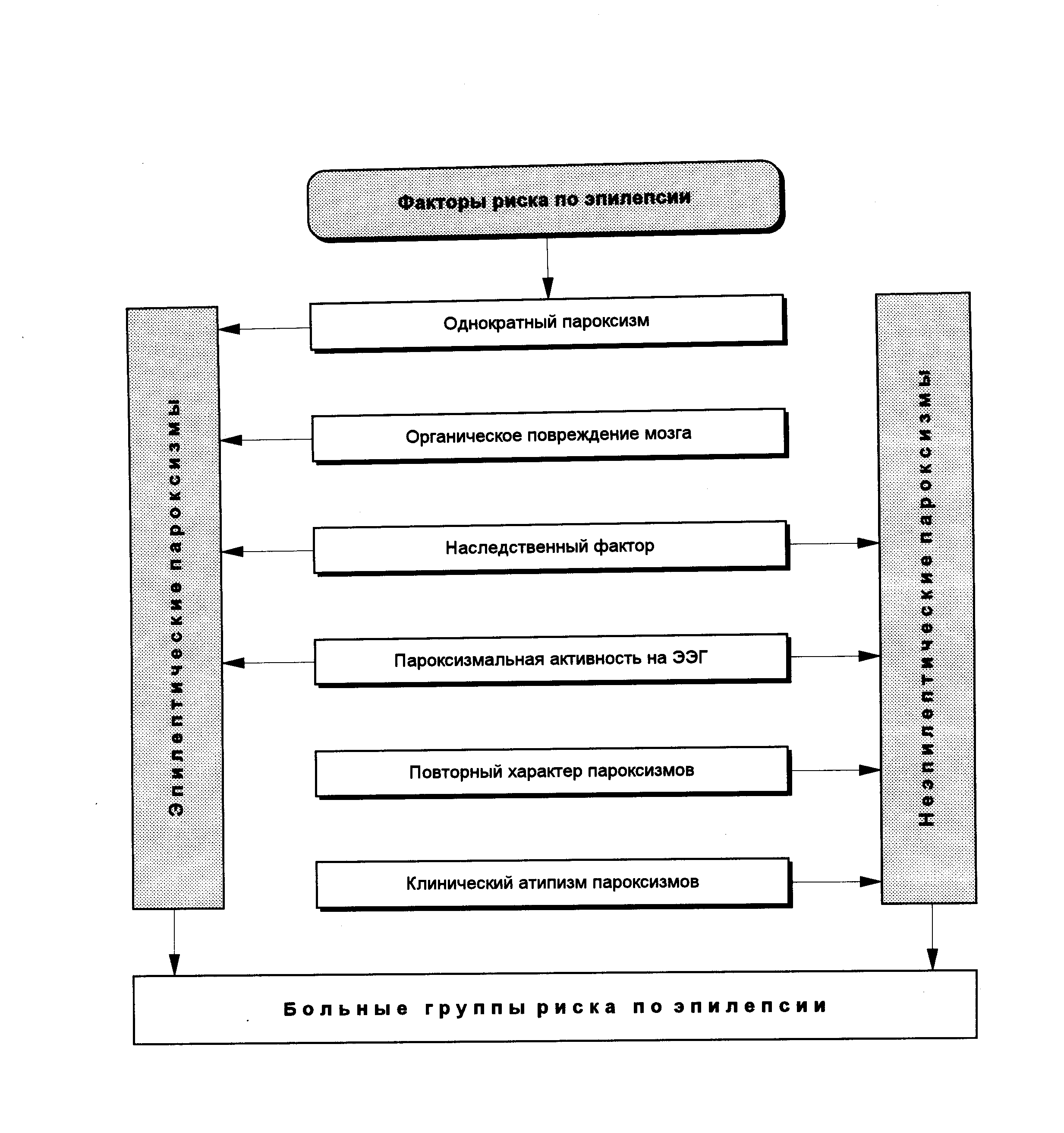 Первый этап медицинской тактики является традиционным для практической деятельности врача. Он состоит в идентификации церебрального характера пароксизма и определении его эпилептической или неэпилептической природы. Решение этого вопроса всегда было непростым делом. И действительно, в процессе дифференциальной диагностики первого пароксизма врач должен проявить весьма высокий уровень профессионализма уже потому, что ему необходимо удерживать в памяти клинические проявления нескольких десятков клинических разновидностей эпилептических припадков и неэпилептических пароксизмов, с тем, чтобы сравнивая их, прийти к определенному выводу. При этом традиционные дифференциально-диагностические трудности акцентируются тем обстоятельством, что пароксизмы являются первыми или немногочисленными. Поэтому широко известные их признаки, выделенные у больных находящихся в развернутой стадии заболевания не всегда могут быть использованы. Речь идет, например, о таких типичных признаках эпилептических припадков у больных эпилепсией, как цикличность, стереотипность клиники, спонтанность и повторность. Производится тщательный анализ клинических проявлений пароксизма и обстоятельств его развертывания, при этом непременно учитываются: возраст больного, возможные провоцирующие факторы, время суток, род занятий, поза, положение тела и общее состояние больного непосредственно перед началом пароксизма. Изучается анамнез заболевания, жизни, наследственный анамнез, результаты объективного соматического, неврологического и дополнительных методов исследования. В случаях непреодолимых затруднений в идентификации эпилептического или неэпилептического характера пароксизма, мы удовлетворялись выявлением признаков указывающих на его церебральную природу, на основании соответствующих критериев, содержащихся в определении церебрального пароксизма, разработанного комитетом экспертов ВОЗ, и приведенного в первой главе. В данной ситуации мы не переоценивали и результаты ЭЭГ исследования, помня о том, что они не могут заменить собой квалифицированную обработку клинического материала или надежно идентифицировать характер пароксизма. Данные литературы и собственный опыт не позволяют сделать вывод о большой ценности ЭЭГ исследования при первых ЦП у детей. Кроме того, при первых безусловно эпилептических пароксизмах, патологические ЭЭГ изменения не должны приобретать прямого диагностического значения. Их следует истолковывать лишь как фактор риска по эпилепсии в связи с тем, что в донозологическом периоде еще отсутствует основной клинический критерий заболевания, определяющий диагноз эпилепсии, а именно повторные спонтанные ЭП. На втором этапе медицинской тактики идентифицированный ЦП относили к одному из четырех возможных клинических вариантов ДПЭ. Причем, если первый пароксизм расценивался в качестве эпилептического припадка, то его относили либо к спонтанным припадкам, либо считали проявлением эпилептической реакции или эпилептического синдрома в соответствии с критериями изложенными выше. При неэпилептическом характере пароксизмов, последние занимали свое место в соответствующем перечне, содержащемся в первой и второй главах. При этом, во всех случаях где это было возможно, в диагнозе заболевания учитывал