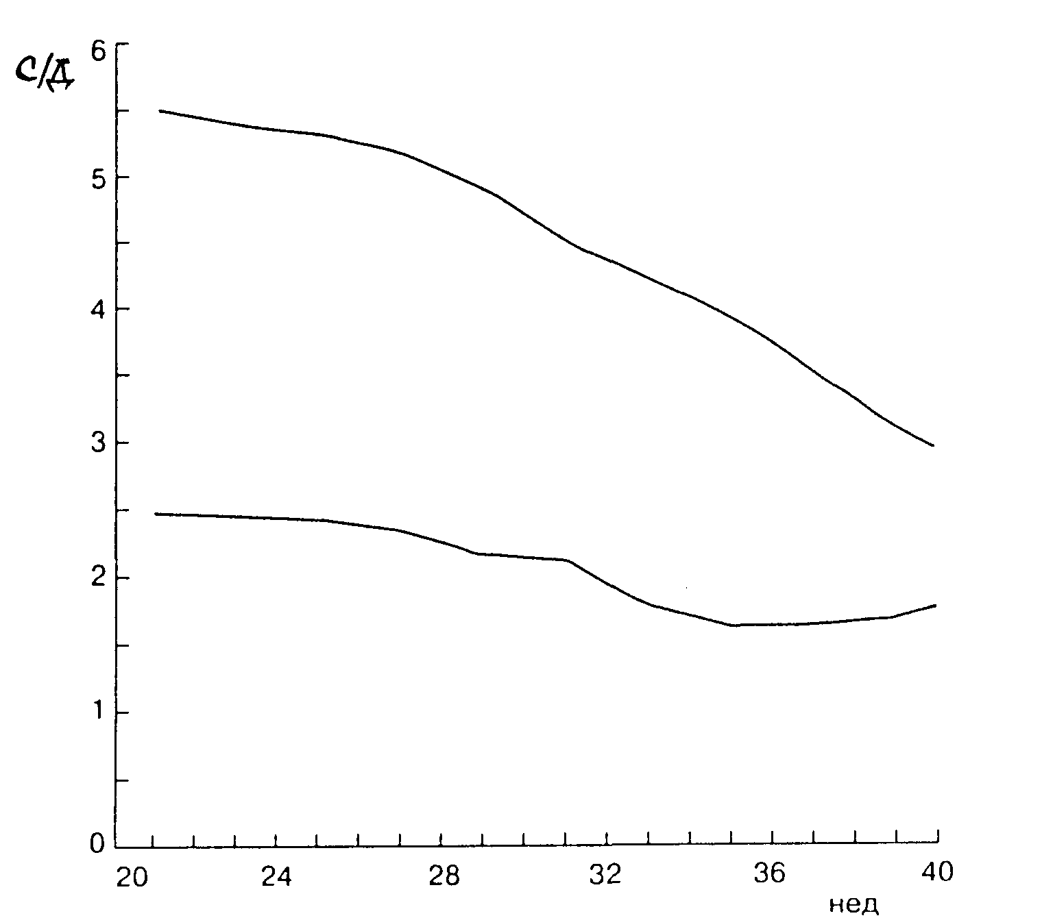 Нормативные показатели отношения СД для артерий пуповины во второй половине беременности.