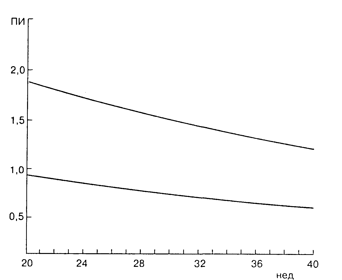 Нормативные показатели ПИ артерий пуповины во второй половине беременности. С.А. Калашников (7). Артерия пуповины в третьем триместре беременности: средняя скорость кровотока - 32-39 см/сек; ПИ - 0,64-0,89. Л.В. Логвиненко (5). Значения показателей кровотока в артерии пуповины в 3 триместре беременности: СДО - 2,6±0,7; ИР - 0,62±0,19. А.Н. Стрижаков (8). Показатели систолодиастолического отношения в артерии пуповины во II и III триместрах неосложненной беременности