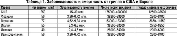 Реферат: Эффективность и безопасность лекарственных средств, применяемых при ОРВИ и гриппеРеферат: Эффективность и безопасность лекарственных средств, применяемых при ОРВИ и гриппеЧл.-кор. РАМН, профессор Ю.Б. Белоусов, С.К. Зырянов, К.Г. Гуревич, РГМУ, МГМСУ им. Н.А. Семашко Более 25% больных ежедневно обращаются к врачу по поводу заболеваний дыхательных путей [1]. Самыми распространенными заболеваниями респираторного тракта являются острые респираторные вирусные инфекции. Так, во время ежегодных эпидемий гриппом переболевают около 10% населения земного шара, во время пандемий число больных возрастает в 4–5 раз. В России ежегодно регистрируется около 50 млн. случаев инфекционных заболеваний. До 90% случаев из регистрируемой инфекционной заболеваемости приходится на ОРВИ и грипп [2]. По данным Федерального центра по гриппу, в России в эпидемию 2002–2003 гг. в среднем переболело гриппом и ОРЗ 28,9% детей в возрасте до 2 лет, 24,3% детей в возрасте 3–6 лет, 17,2% детей 7–14 лет, 3,5% взрослого населения (от 15 лет и старше). По данным МЧС России, в период эпидемии 2003 года общее количество переболевших ОРВИ и гриппом составило 30 миллионов человек. Экономические затраты на оплату лечения и листов нетрудоспособности составили 50 миллиардов рублей. Острые респираторные вирусные инфекции опасны прежде всего развитием осложнений: бронхитов, пневмоний, синуситов и др. А учитывая тот факт, что грипп и ОРВИ в первую очередь поражают наиболее уязвимые группы населения (детей и пожилых), присоединение вторичной инфекции на фоне ослабленной иммунологической реактивности всегда опасно развитием летального исхода. По данным ВОЗ, от ОРВИ и их осложнений ежегодно умирает 4 млн. детей в возрасте до 5 лет, причем доля детей до 1 года среди умерших составляет более 66%. В 75% случаев причиной детской смертности от ОРВИ является острая пневмония [3]. В США смертность от гриппа и его осложнений составляет ежегодно в среднем 20 тыс. человек, при этом 80–90% летальных исходов отмечается в возрастной группе старше 64 лет [4]. В таблице 1 приведена статистика годовой заболеваемости и смертности от гриппа в зарубежных странах.