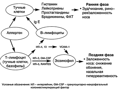 Схема 1. Механизмы развития аллергического ринита Доказано, что в основе АР лежит Ig E–зависимая гиперчувствительность (I тип аллергических реакций по P. Gell, R. Coombs, 1975). Клиническим проявлениям болезни предшествует период сенсибилизации (иммунологическая стадия), в течение которого аэроаллергены, обладающей фактором проницаемости, достигают антиген–презентирующих клеток (клеток Лангерганса и макрофагов). После расщепления аллергенов эти клетки представляют их антигенные детерминанты Т–лимфоцитам хелперам (cхема 1). Следующим этапом является образование из Т–клеток Т–лимфоцитов хелперов 2 типа, которые продуцируют цитокины, отвечающие за синтез реагинов B–лимфоцитами (интерлейкины 4 и 13) и активацию эозинофилов (интерлейкины 3, 5, гранулоцитарно– макрофагальный колониестимулирующий фактор, RANTES). Ig E за счет длинного Fc–фрагмента фиксируются на поверхности тучных клеток и базофилов слизистых оболочек дыхательных путей. Собственно аллергическая реакция начинается с взаимодействия аэроаллергенов с реагинами, при котором каждый антиген связывается с двумя молекулами антител. Это является стимулом для секреции тучными клетками преформированных (гистамина, хемотаксических факторов, химазы, триптазы, гепарина и др.) и вновь образующихся медиаторов (лейкотриены, фактор активации тромбоциты и др.) аллергии (патохимическая стадия). В результате возникают клинические симптомы ранней фазы аллергической реакции, развивающейся спустя 15–20 мин после контакта с аллергенами (зуд, чихание, ринорея и заложенность носа, и др.). Через 4–6 часов после взаимодействия с аллергеном формируется поздняя фаза реакции, в которой участвуют эозинофилы, базофилы, лимфоциты, нейтрофилы (патофизиологическая стадия). Накопление этих клеток, обусловленное молекулами адгезии, приводит к развитию аллергического воспаления, ответственного за гиперреактивность слизистой оболочки носа в ответ на действие различных факторов внешней среды. Центральную роль в его формировании отводят эозинофилам. Считается, что их избыток в тканях обусловлен повышением продукции в костном мозге, увеличением продолжительности жизни, активацией прилипания к сосудистому эндотелию и хемотаксиса. Показано, что адгезия к стенке при АР осуществляется за счет повышенной экспрессии молекул клеточно–сосудистой адгезии (VCAM–1), рецепторами для которых служат b1–интегрины клеточной стенки эозинофилов. Наличие назальной гиперреактивности, проявляющейся появлением симптомов ринита в ответ на действие ирритантов, холода, физической нагрузки часто является основанием для постановки больному диагноза «вазомоторно–аллергический ринит». Следует отметить, что согласно международным рекомендациям термин «вазомоторный ринит» следует использовать для обозначения идиопатического ринита [1,2]. Именно по этой причине применение в клинической практике сочетания «вазомоторно–аллергический ринит» является неправильным. Известно, что АР часто предшествует развитию бронхиальной астмы и способствует ее более тяжелому течению. Механизмы этой связи являются предметом интенсивных исследований. Предполагается, что она обусловлена: Выключением защитной и кондиционирующей функции полости носа, что сопровождается усилением влияния аллергенов, поллютантов и холодного воздуха на ни