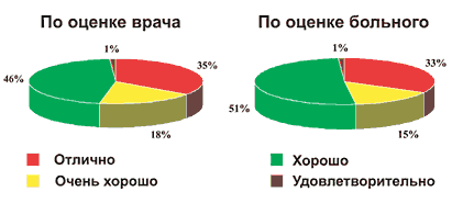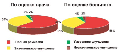 Рис. 4. Динамика общих симптомов у больных в процессе лечения Результаты лечения представлены на рисунке 5. Из полученных данных видно, что оценка эффективности Летизена врачами и больными совпадала. Положительные результаты были достигнуты у всех обследованных, причем в большинстве случаев наблюдалась полная ремиссия АР. Отсутствие эффекта не отмечалось ни у одного больного.